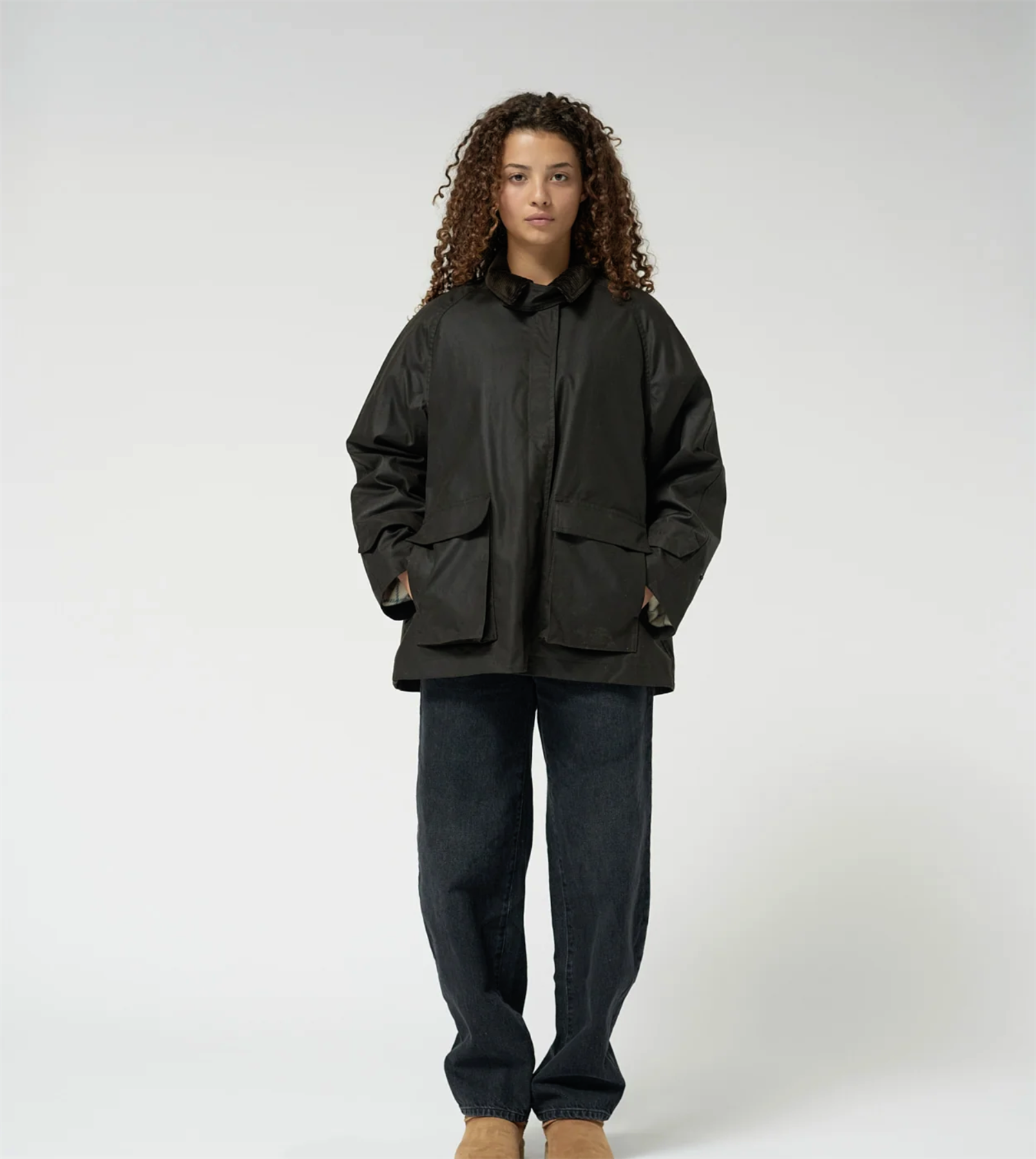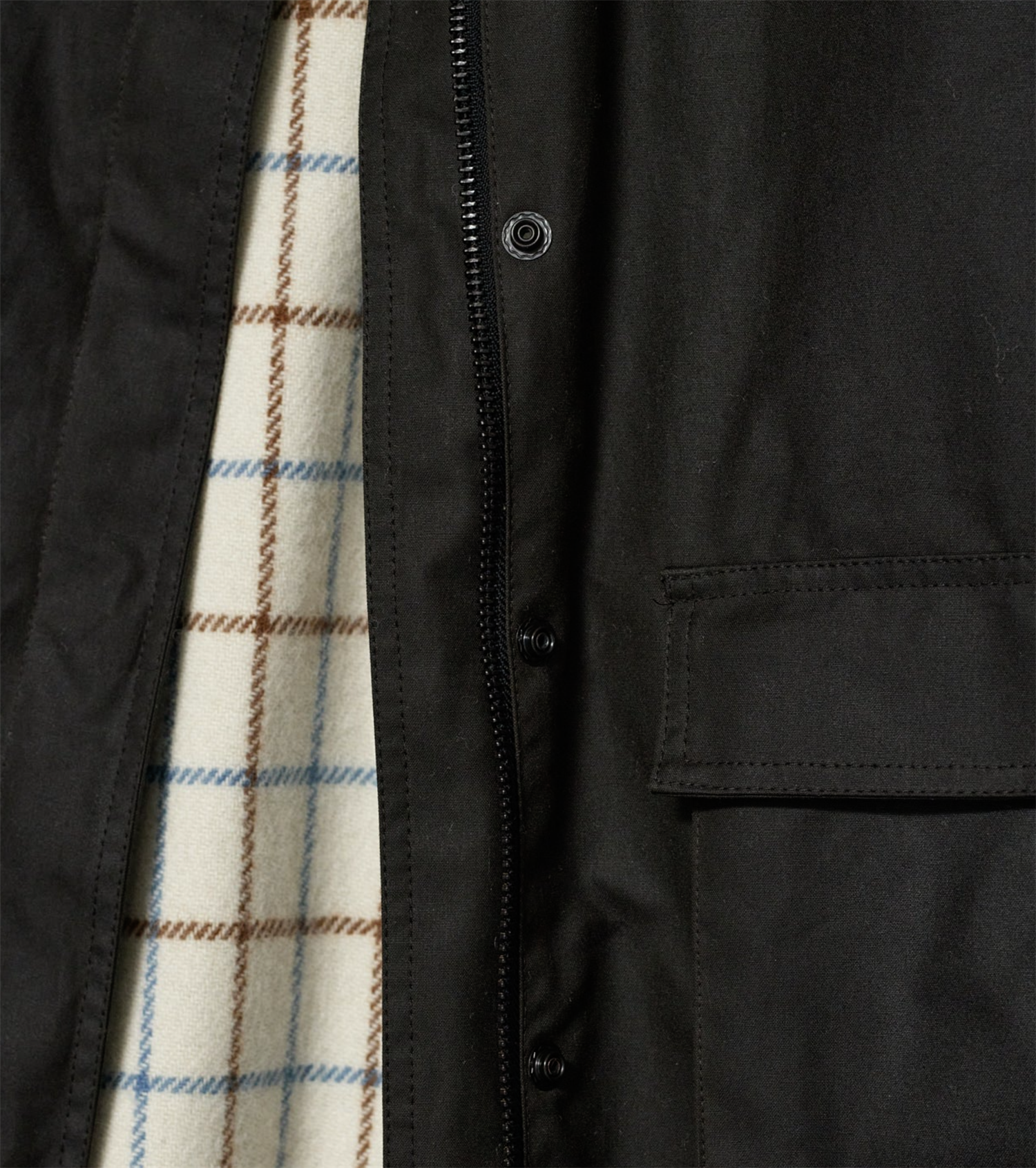 This warm and hardwearing weatherproof oilskin jacket is made using a traditional wax finish cotton from waxed cotton manufacturers British Millerain with wool lining. As it is a heavier wax cotton, the wax stays embedded in the cotton longer, which is also what gives the garment its distinct, nostalgic scent and comforting weight.