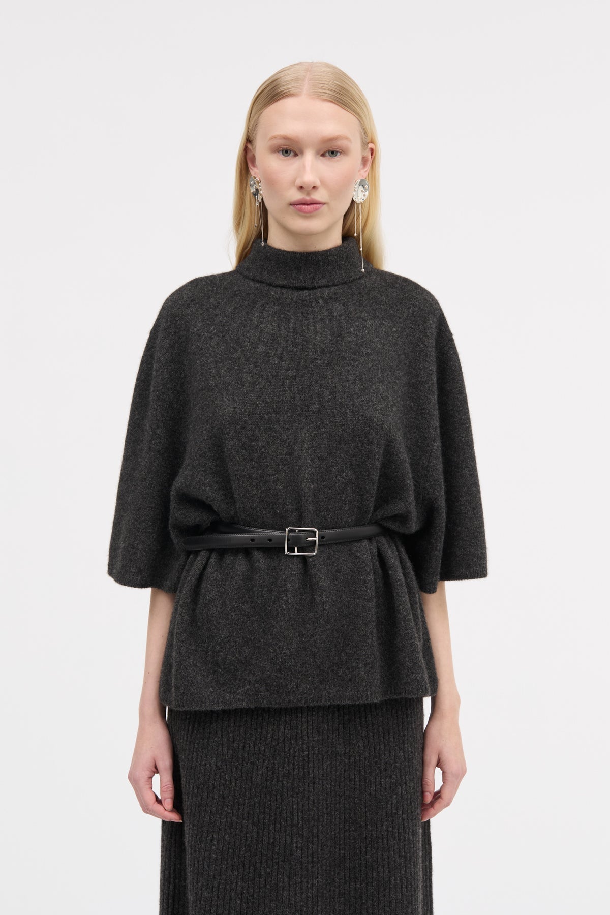 Discover the minimalist luxury of this dark grey melange knitted blouse, featuring bat sleeves and a loose fit. Perfect for those who appreciate refined and architectural design, this piece embodies a calm elegance rooted in Nordic aesthetics.