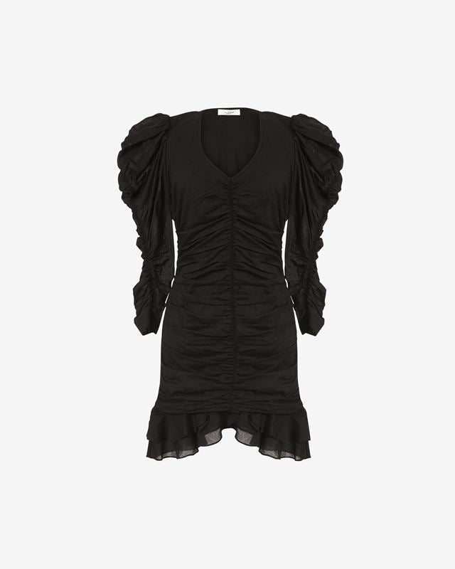 Short sleeved dress, with a slim fit. This dress comes in a classic black. The dress has a V-neckline and a ruffle detail at the end of the dress. Zip fastening.