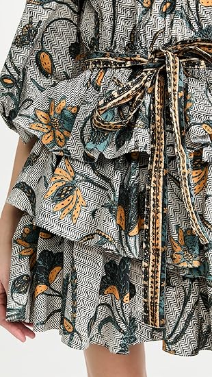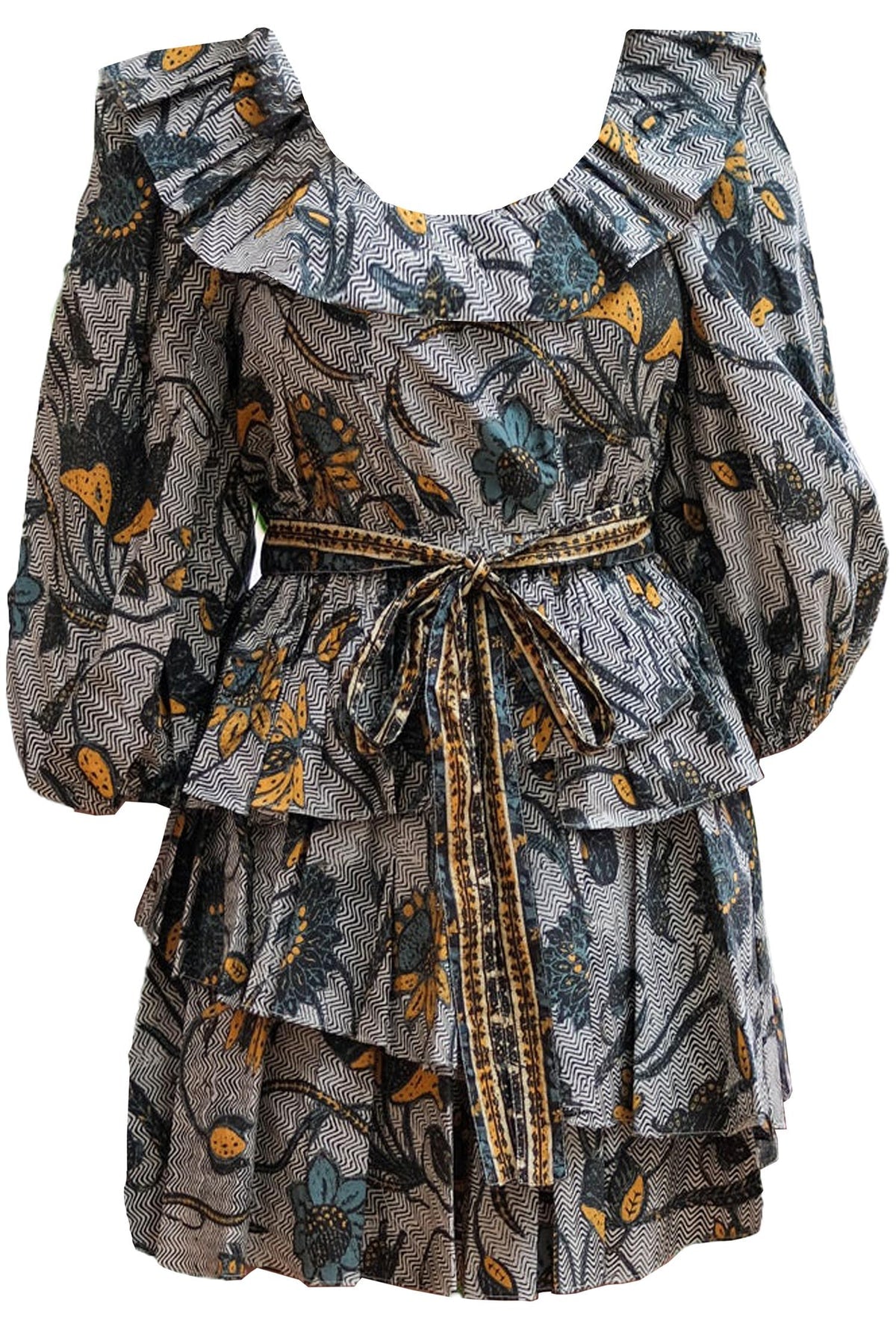 The Giselle mini dress is cut in cotton poplin, and is defined by its ruffled bateau neckline that is layered on top of billowing 3/4 length sleeves. Features a comfortable elastic waist and asymmetric ruffles adorning the skirt. The sash is removable.