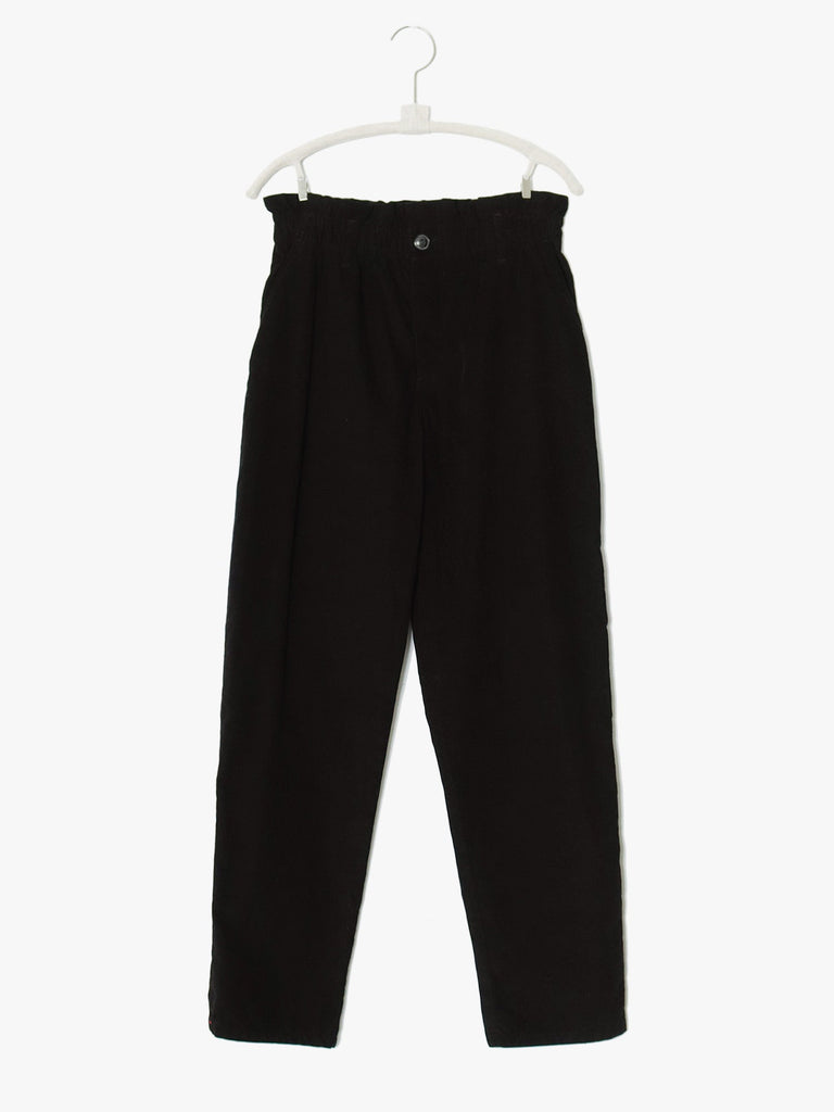 Let Loose. Theo is new this season in our supple baby corduroy. This easy straight leg pant has an elastic paper bag waist with button fly, side seam pockets, and back left pocket.