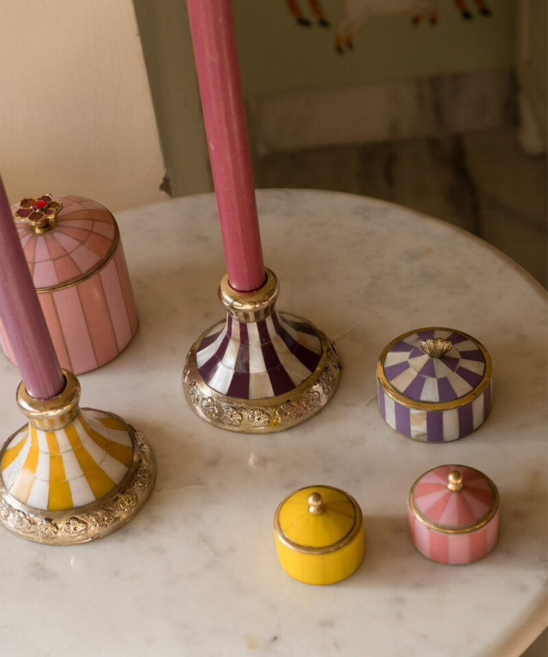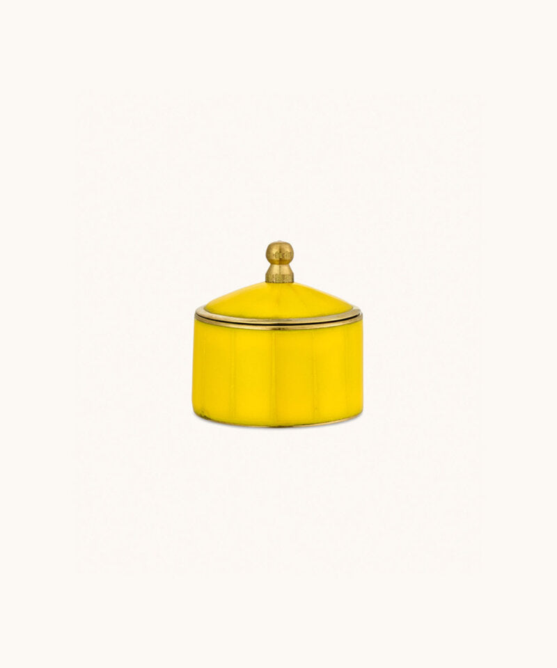 Add a pop of color and charm to your interior with the Bailey Circus Box Small Yellow, a beautifully handcrafted storage box that blends playful design with refined elegance. With its vibrant yellow finish, dome-shaped lid, and polished golden brass details, this compact jewelry box (5 x 5 x 5 cm) is ideal for storing rings, earrings, trinkets, or other precious items.