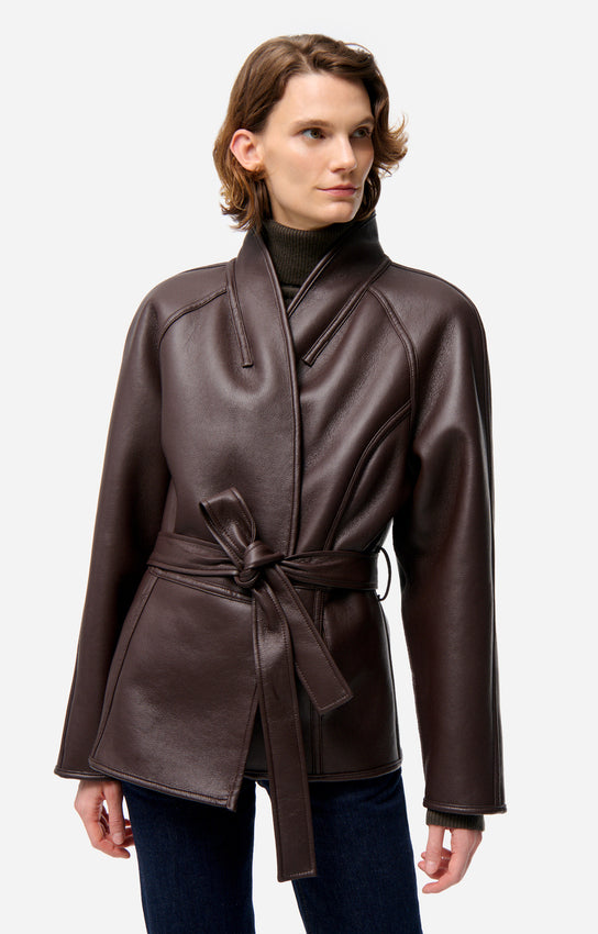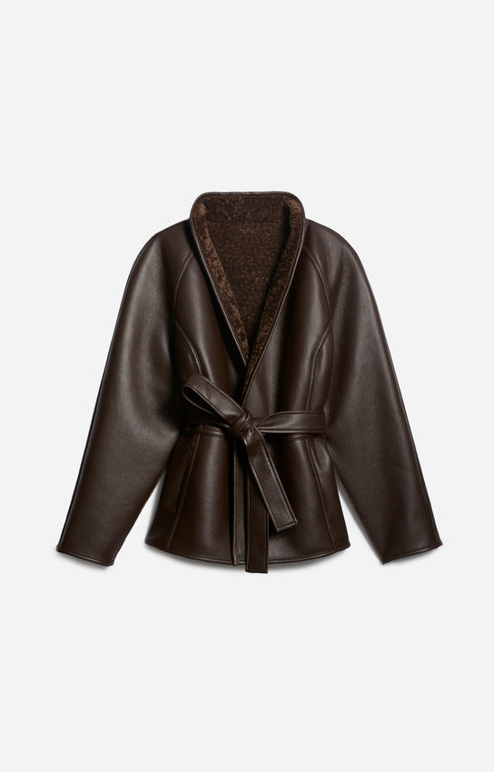 Warm and elegant, this faux fur jacket stands out with its loose fit and tie belt, for a look that is as comfortable as it is sophisticated.