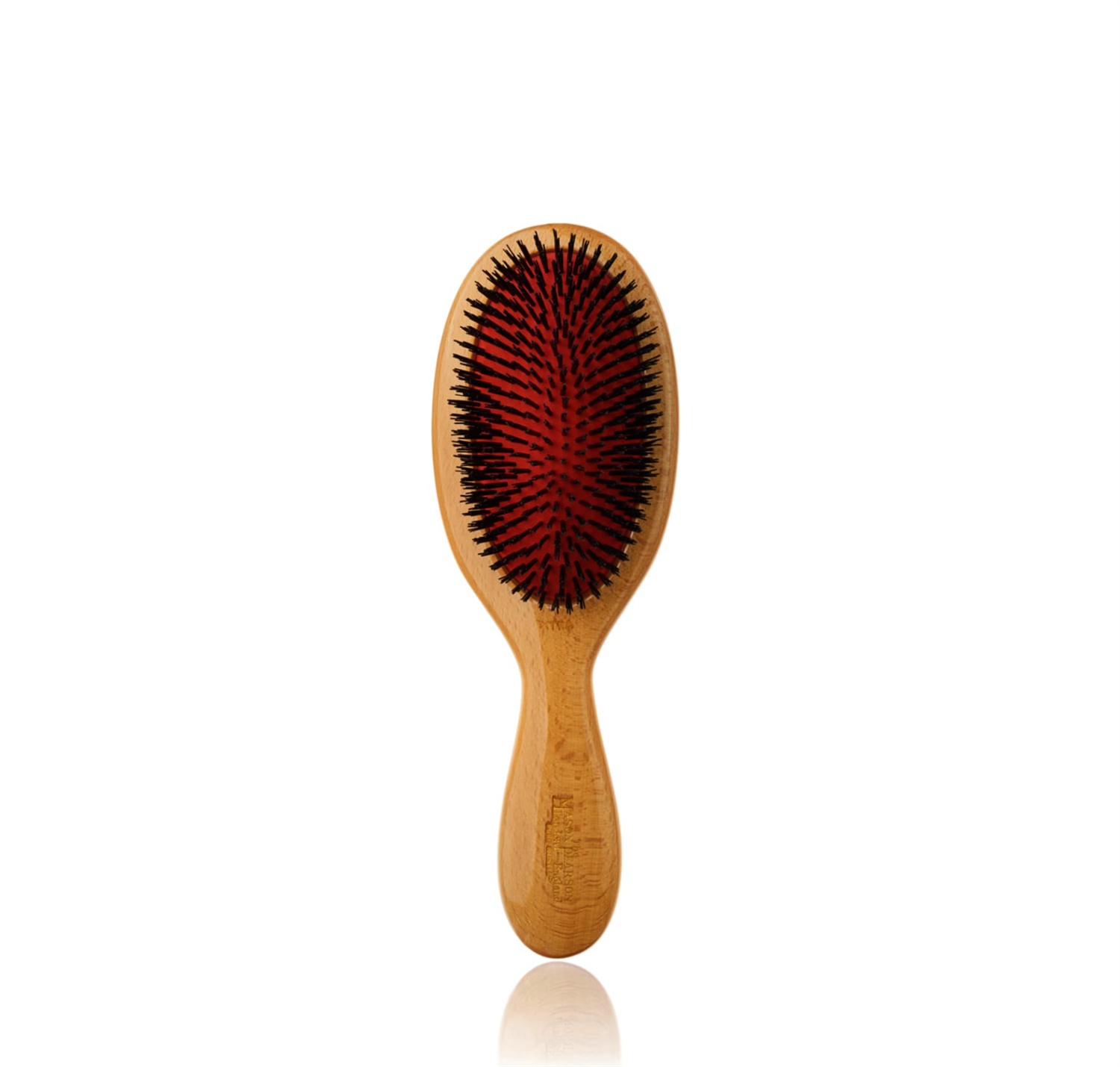 The brush features ethically sourced boar bristles with seven rings of tufts on a rubber cushion pad that offer maximum distribution of the hair’s natural, nourishing oils while stimulating blood circulation in the scalp. The ultimate secret to strong, shiny, lustrous hair.