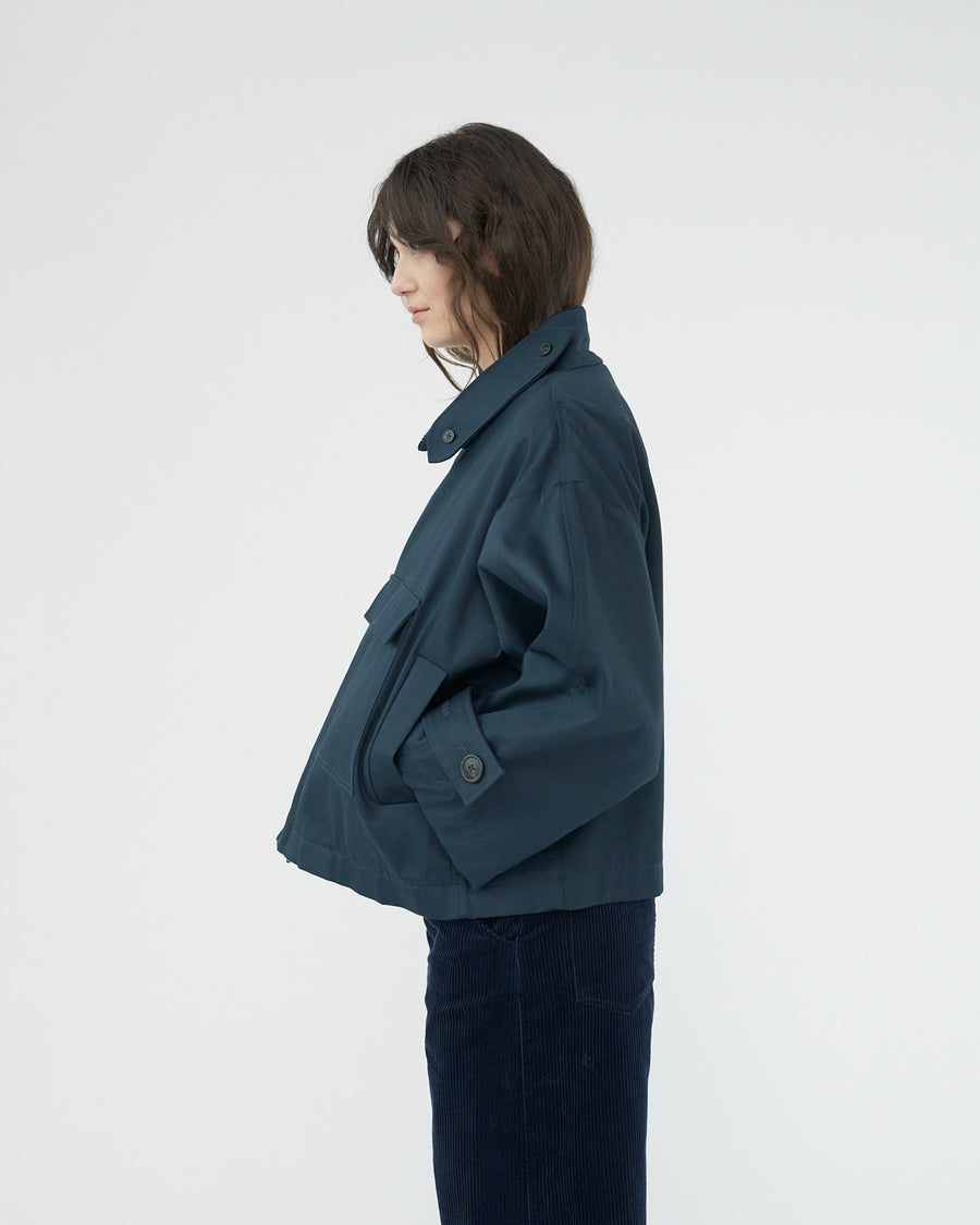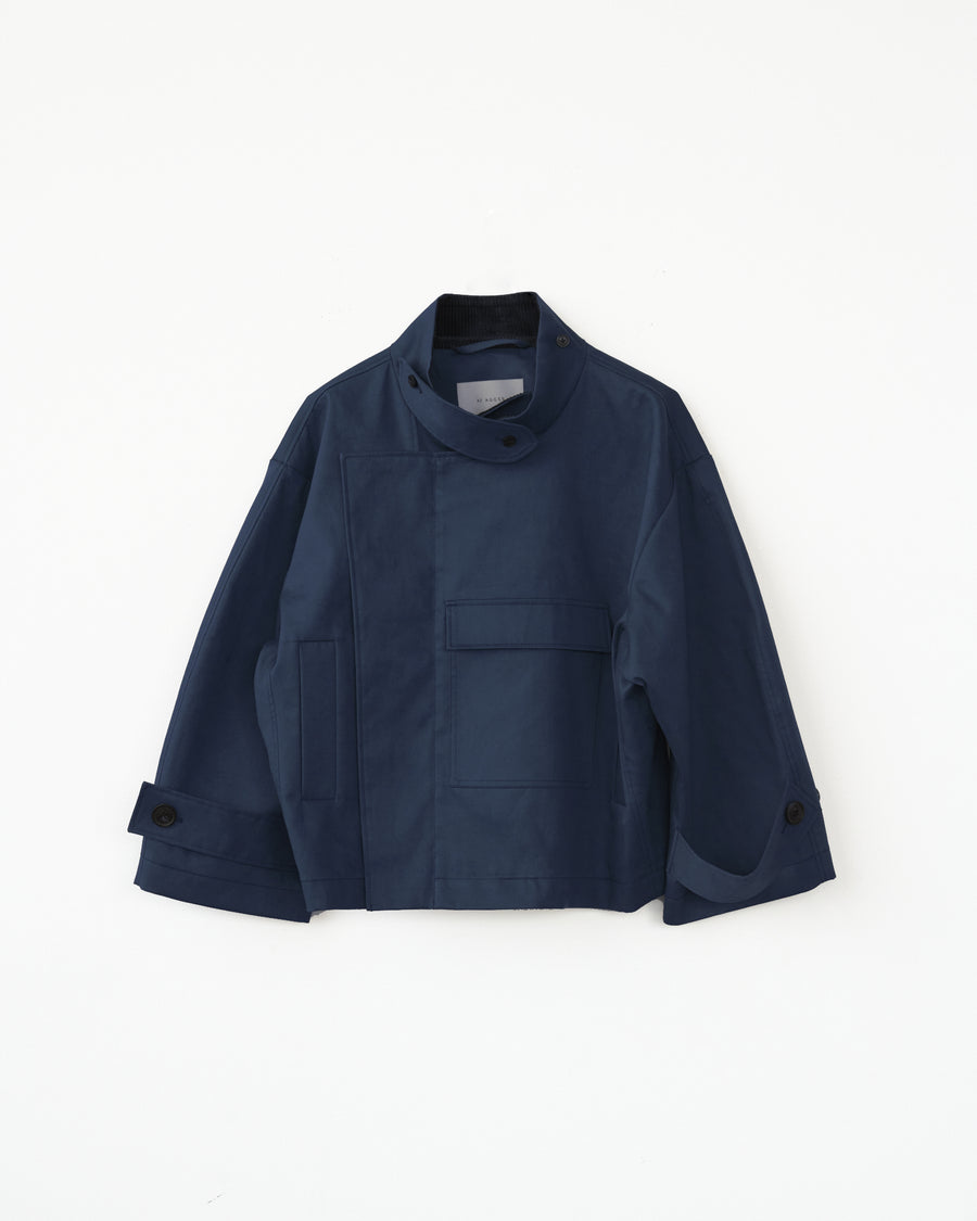 WATER RESISTANT COTTON TWILL JACKET WITH MATCHING CORDUROY INNER COLLAR. SIDE CLOSURE WITH ZIP AND HORN BUTTONS. LARGE CENTER POCKET AND TWO SIDE POCKETS.