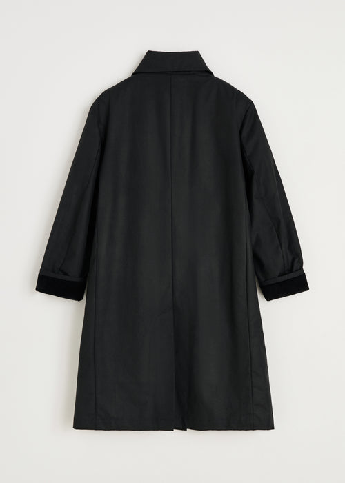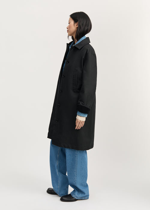 A classic oilskin coat made from organic cotton canvas with a natural coating based on olive oil. Designed with a regular silhouette, delicate collar, hidden horn button closure, and convenient side pockets. The coat is lined with soft corduroy along the collar and cuffs for an elegant, refined look. The natural oilskin coating gives the fabric a unique, matte finish that makes it both durable and wind- and water-repellent. Please note that, due to treatment with natural olive oil and without any chemicals, the jacket may have a slight scent upon receipt. This scent will gradually fade over time.