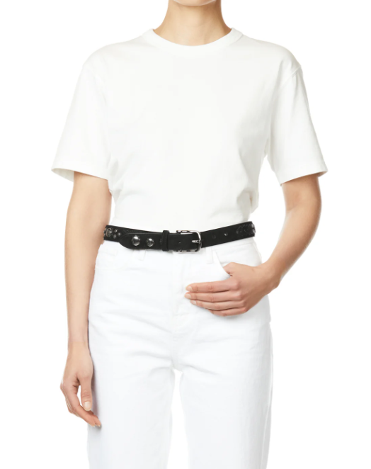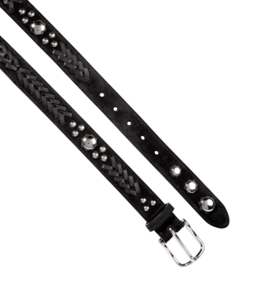 Belt with large domed metal rivets. Adjustable waistband. Can be worn hip-high or high-waisted.