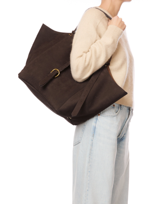 Bag with adjustable handles from 40 cm to 74 cm, allowing for hand or shoulder carry. Closure with a hand-braided central tab. Features a single main compartment with an interior flat pocket, as well as a pouch attached inside with a leather tie.