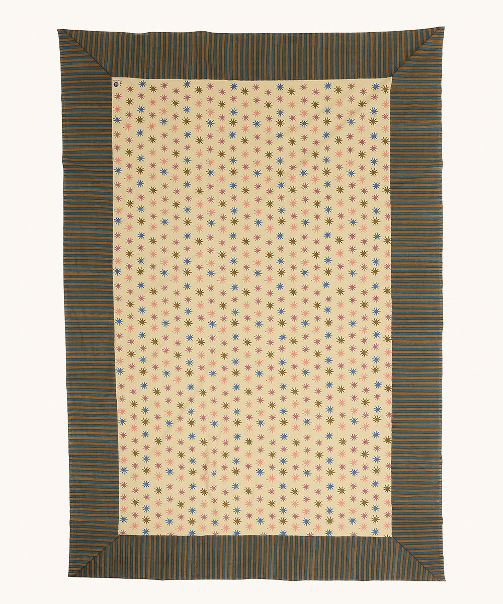 Looking for the perfect festive tablecloth for your gatherings? The Noa Star Single Throw is just what you need. Measuring 140 x 220 cm, this charming throw is perfect for adding a cheerful look to your dining experience. The Noa Star Throw showcases a delightful pattern of colorful stars on a warm beige background, highlighted with bold stripes for an eye-catching contrast. Each piece is handcrafted from 100% cotton by our skilled artisans in India using traditional block-printing techniques.