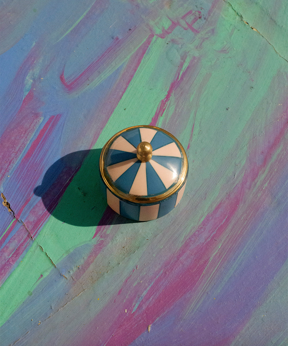Enhance your space with the Bailey Circus Box Blue, a beautifully handcrafted box that combines playful charm with sophistication. Featuring a delightful blue and pink striped pattern accented with golden brass details, this piece is both decorative and practical. Compact in size (5 x 5 x 5 cm), it’s perfect for storing jewelry, trinkets, or other small treasures.
