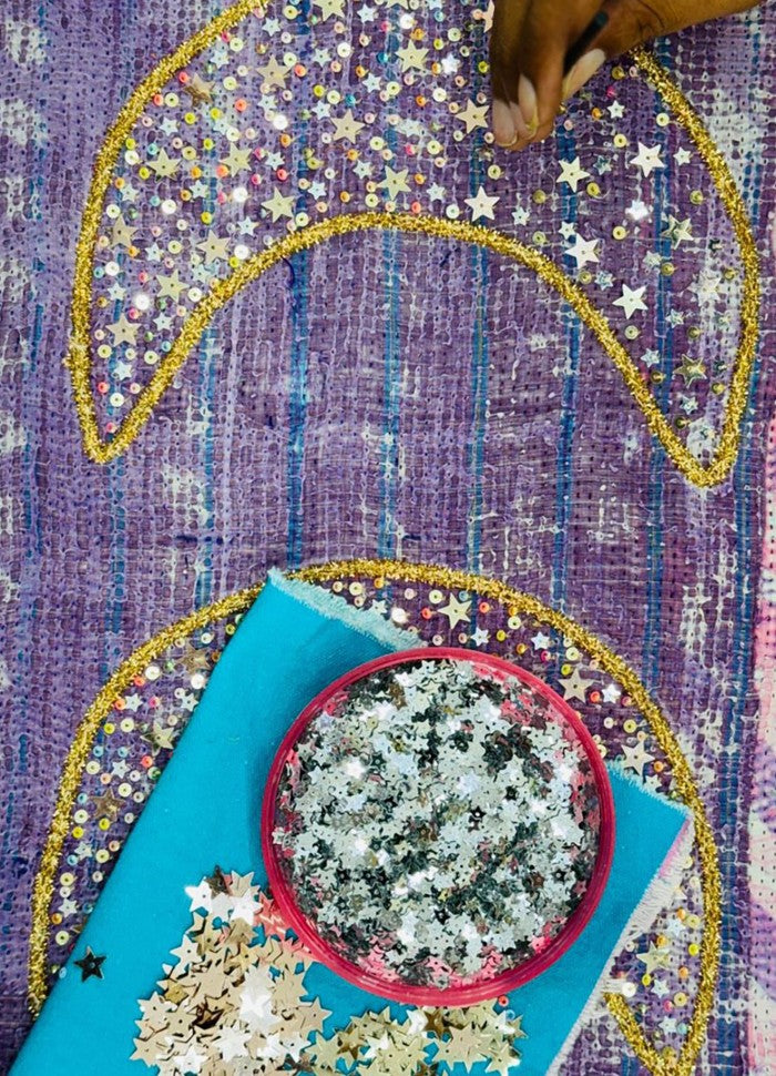 Year after year you can decorate your Christmas tree with this Top Moon. The kantha used for this item is kantha cuttings that are left over from production of the upcycled kantha blanket garments in our collections. The kantha embroidery technique, creatively upcycles old cotton saris, that previously have been worn by Indian women, giving them new life as upcycled items. This technique is characterized by the many rows of short, continuous stitches – a method that has been used in India for hundreds of years and especially common among women in the countryside. As part of our values, we cherish the idea of upcycling and using existing leftover fabrics. Due to the nature of kantha, you may find different colors on the back of the item, additional fabric patches, smaller imperfections such as small stains and spots or extra stitching that adds to its unique charm.