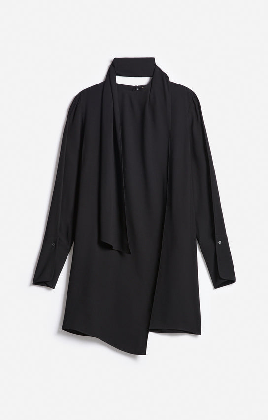 Elegant and timeless, this black dress stands out with its flowing cut and lavallière collar, for a look that is both minimalist and sophisticated.