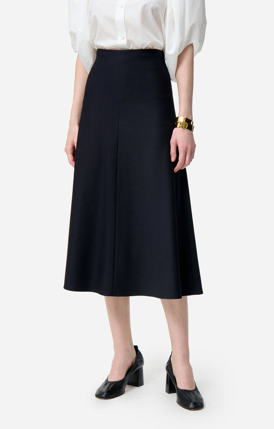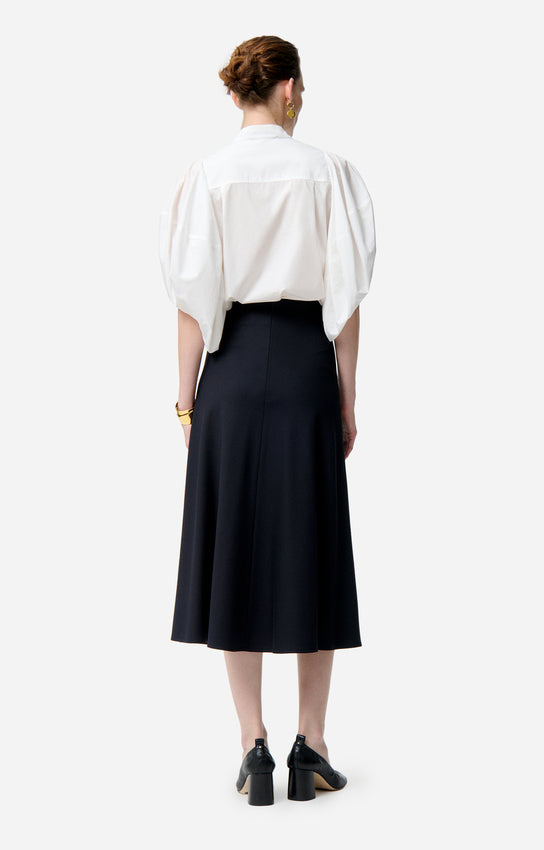 With its flared cut and fluid drape, the BOUSHRA skirt embodies timeless elegance. A midi style with subtle volume, perfect for structuring a silhouette with lightness.