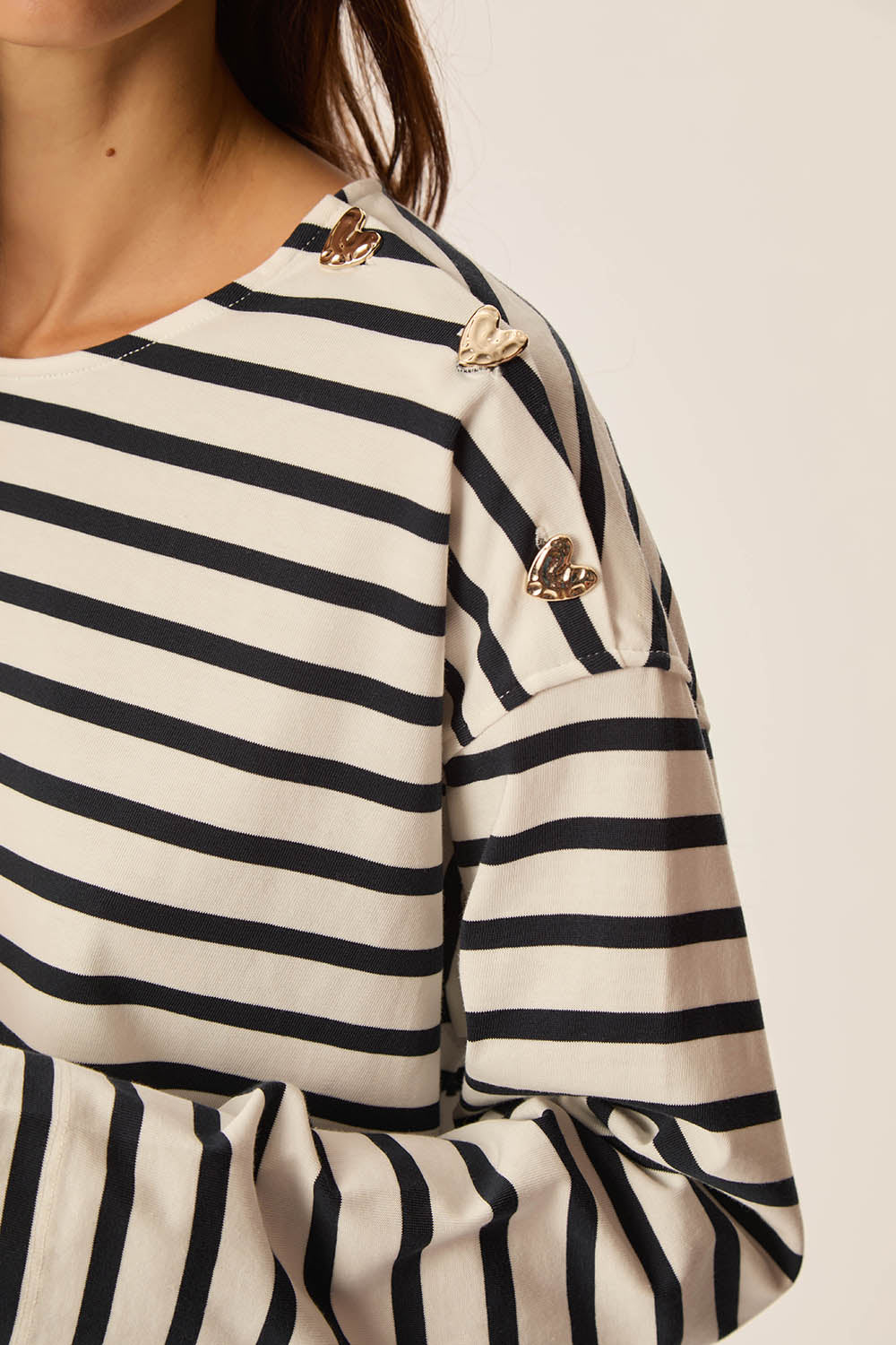 Exclusively created to celebrate the 25th anniversary of Des Petits Hauts, the Filoute striped top is made from thick cotton jersey that lasts, this collector's piece boasts gold-coloured heart-shaped buttons that nestle on the shoulder like shimmering jewels.