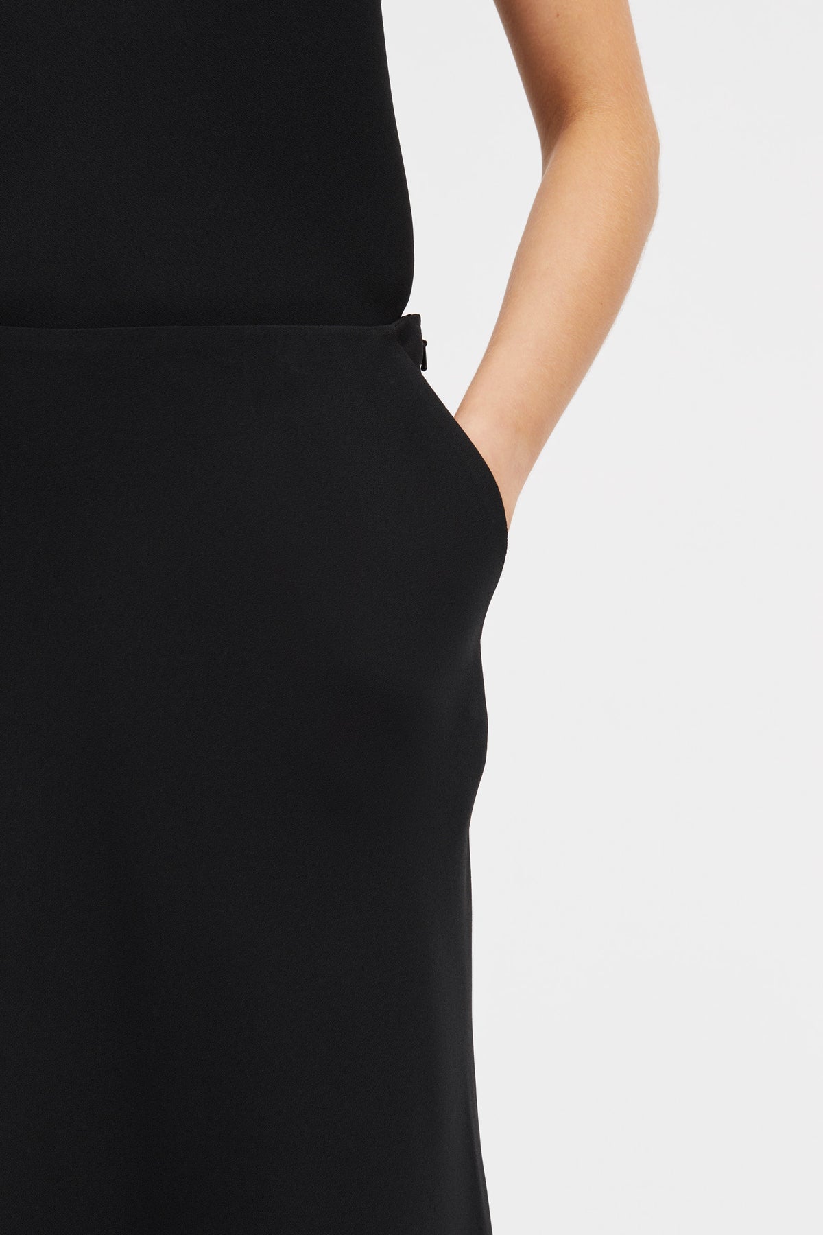 Half sun skirt with slanted pockets. Cut on bias.