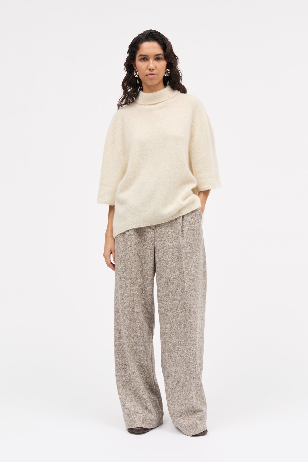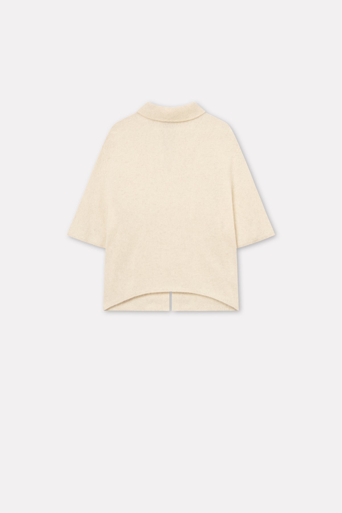 Discover the minimalist luxury of this ivory knitted blouse, featuring bat sleeves and a loose fit. Perfect for those who appreciate refined and architectural design, this piece embodies a calm elegance rooted in Nordic aesthetics.