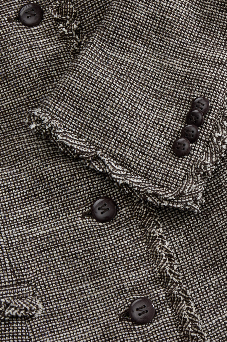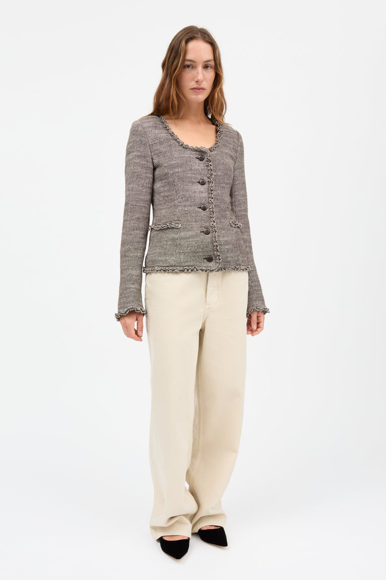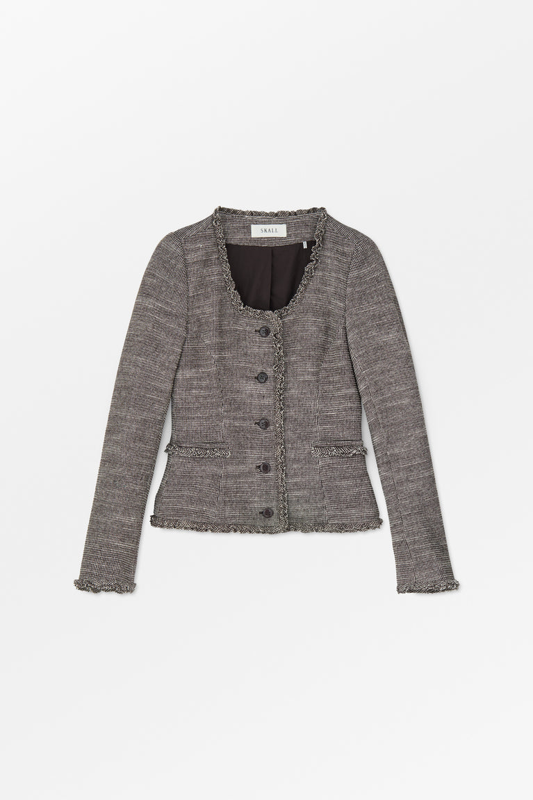 Rosa Jacket is a long line collarless fitted jacket made from a blend of organic cotton and wool. It has buttons up the front and, on the cuffs, and has raw edged bias tape around the neck and hem and cuffs. Two functional patch pockets, also with raw edge tape are placed on the front and the jacket is fully lined.