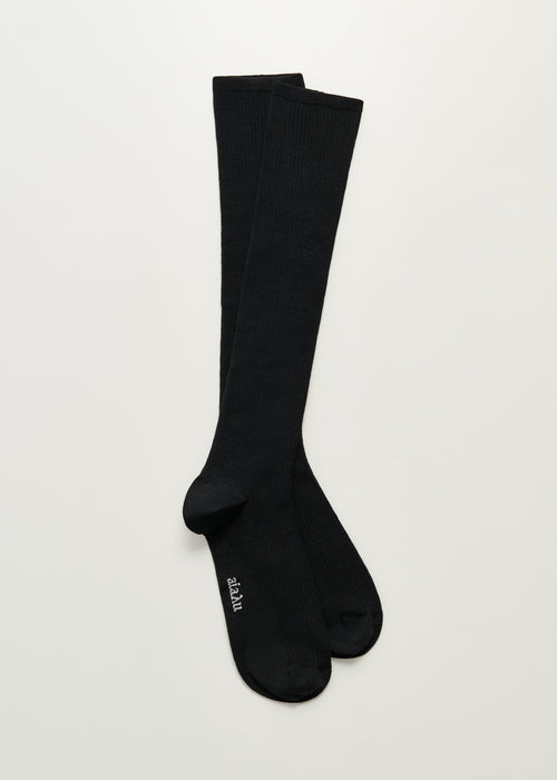 A pair of soft, knee-length wool socks in a thin, refined rib knit. The socks are designed in a flexible fit with a decorative embroidered aiayu logo as well as reinforced heel and toe for optimized fit and durability.
