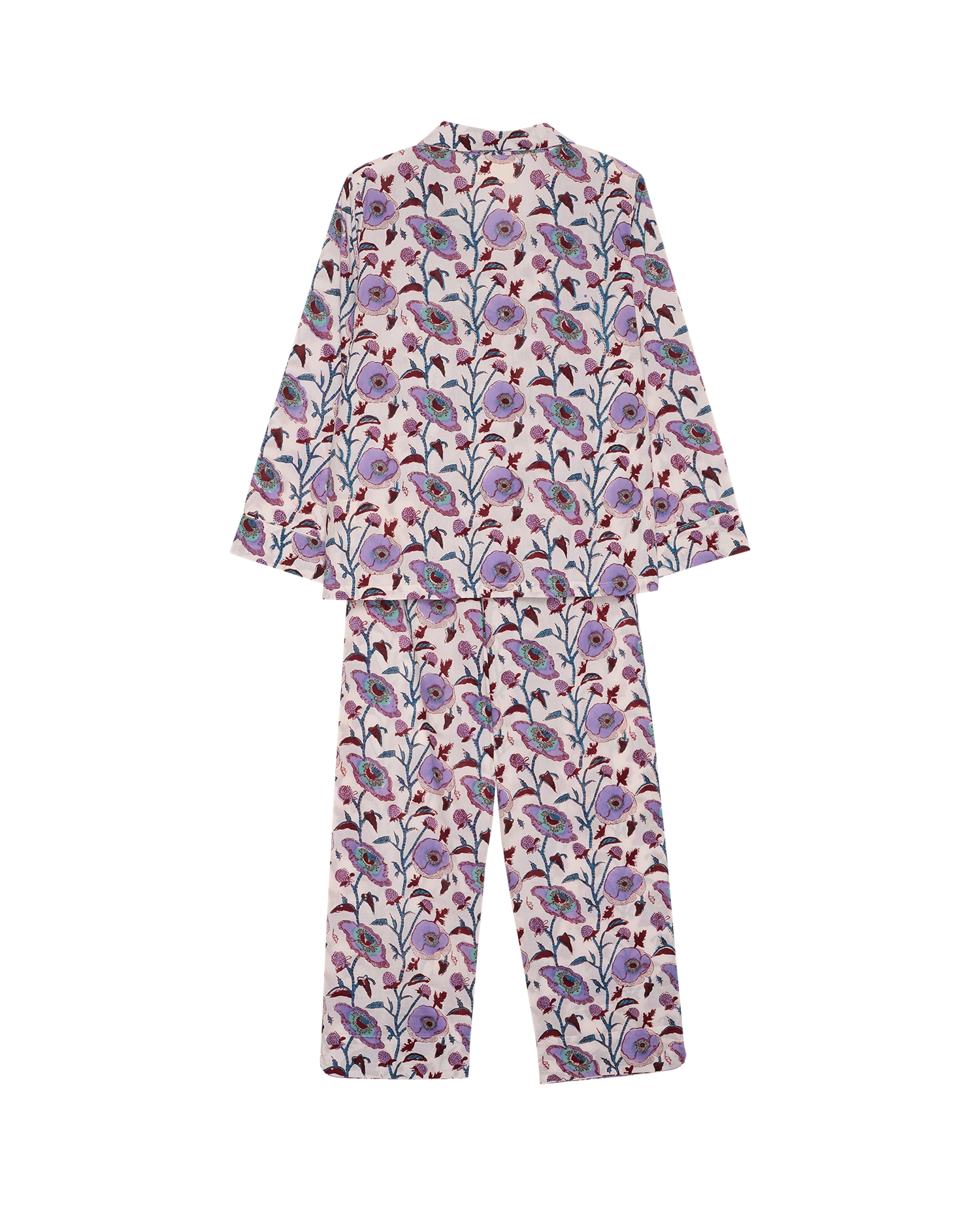 Our pyjamas feature a handmade block print applied by artisans. Because every motif is stamped by hand you have to accept there is variations, specks, or imperfections on this garment.