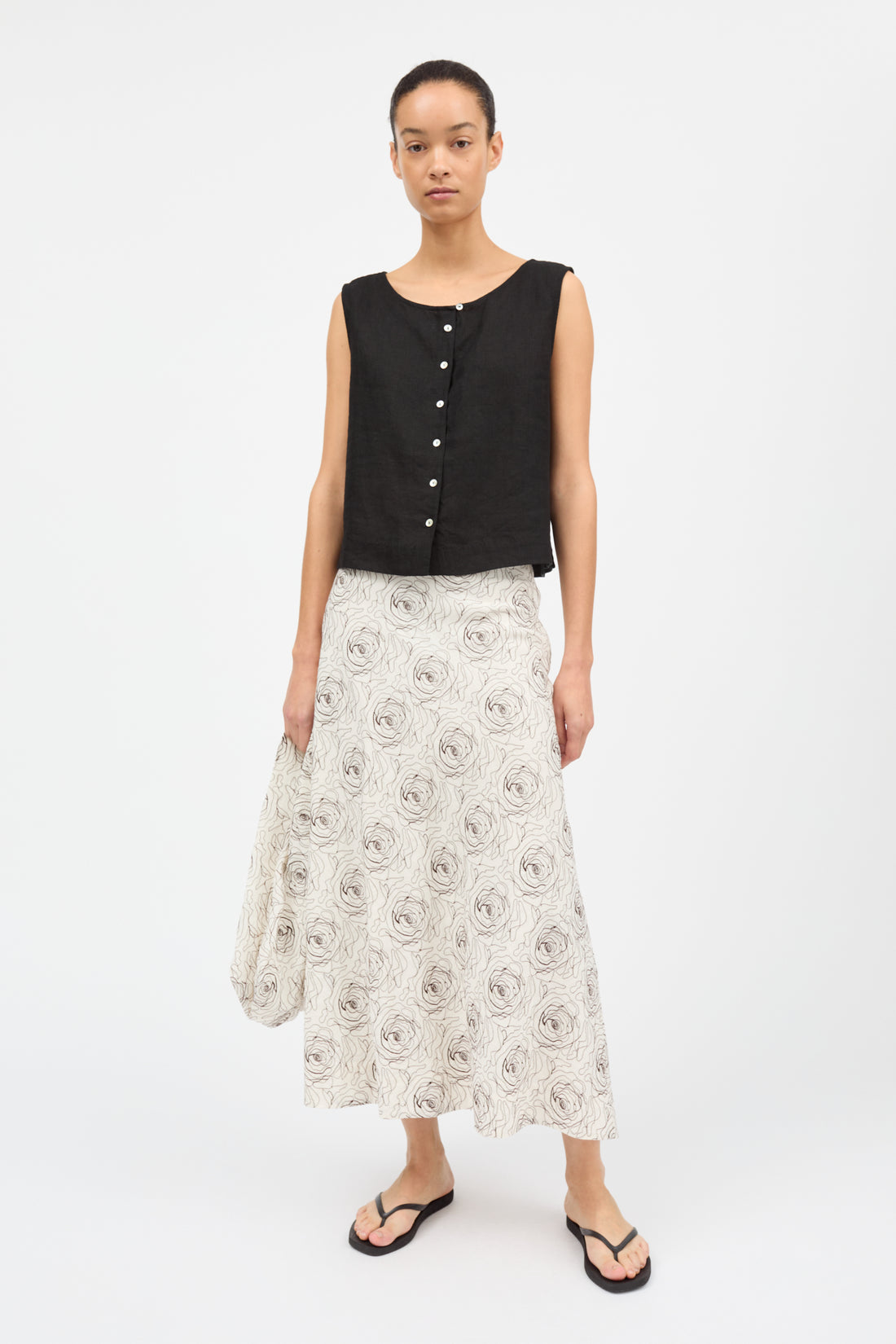 Long bias-cut skirt with all over rose embroidery.