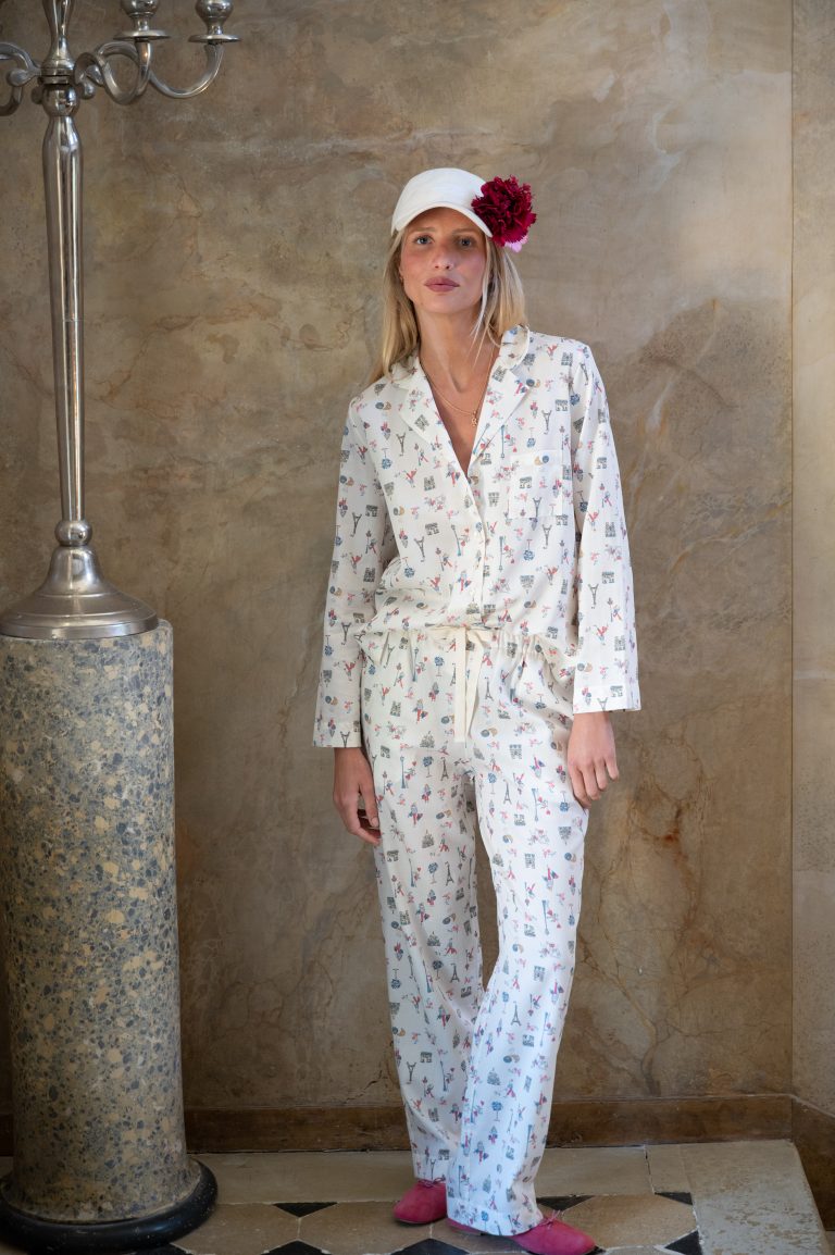 Pyjamas with hand-drawn patterns depicting a little Parisian girl in front of Parisian monuments. Colours: blue, red and beige on a milky white background. Refined, feminine and fresh. Cotton satin Oeko-Tex.