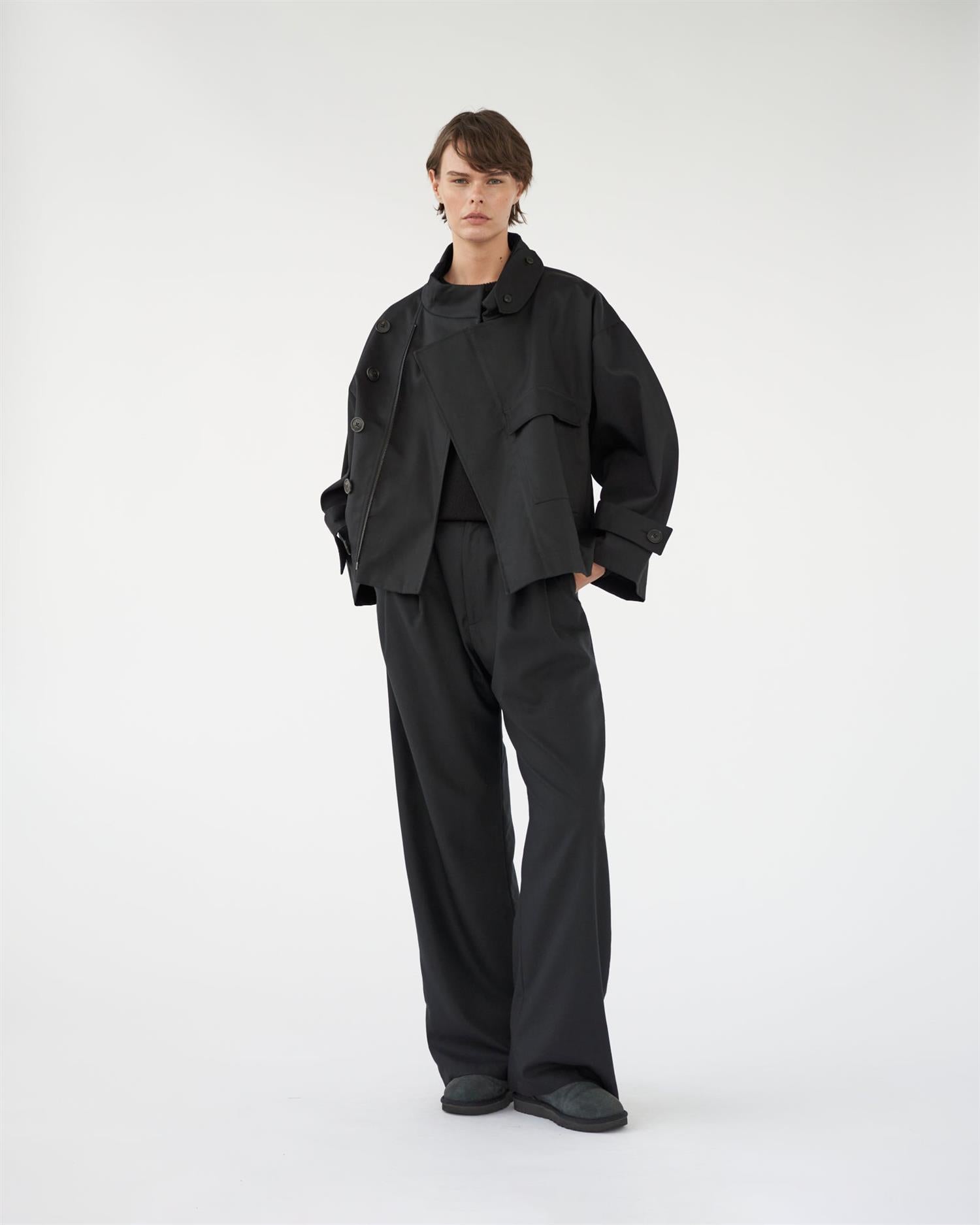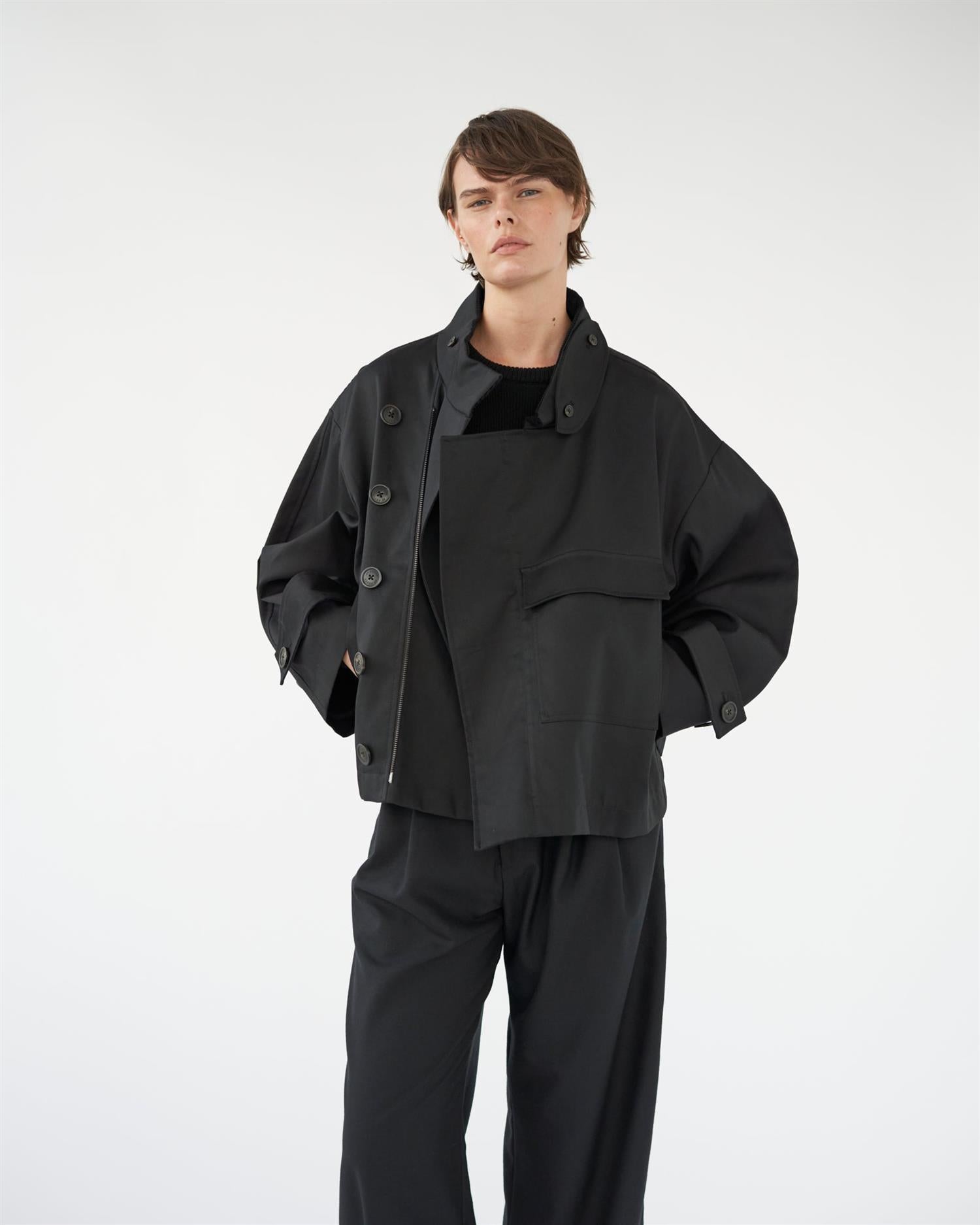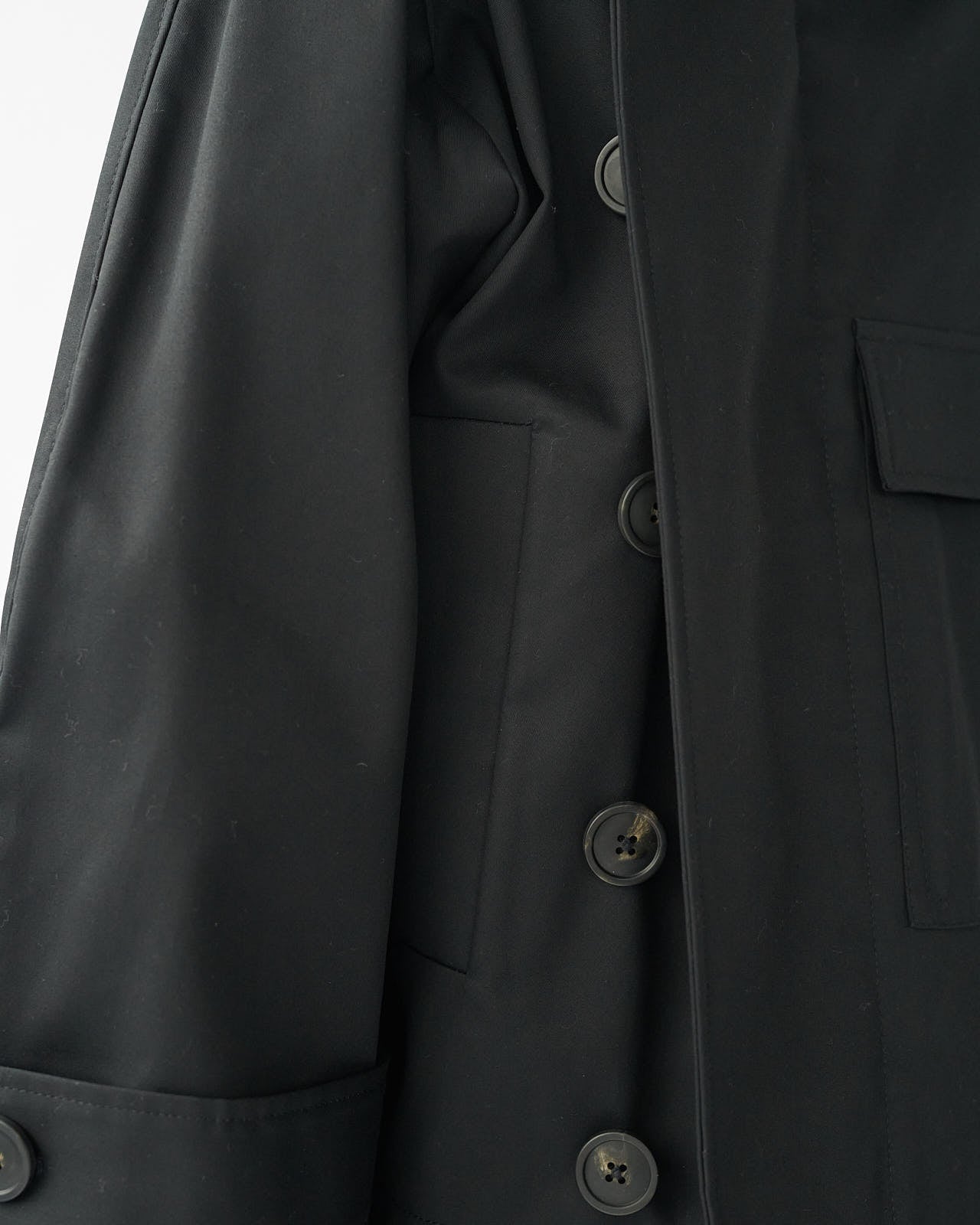 Black metal zip and fly front 5-button closure. Matching corduroy on inner collar. Throat latch. Black inside. Seams bonded with black bias binding.