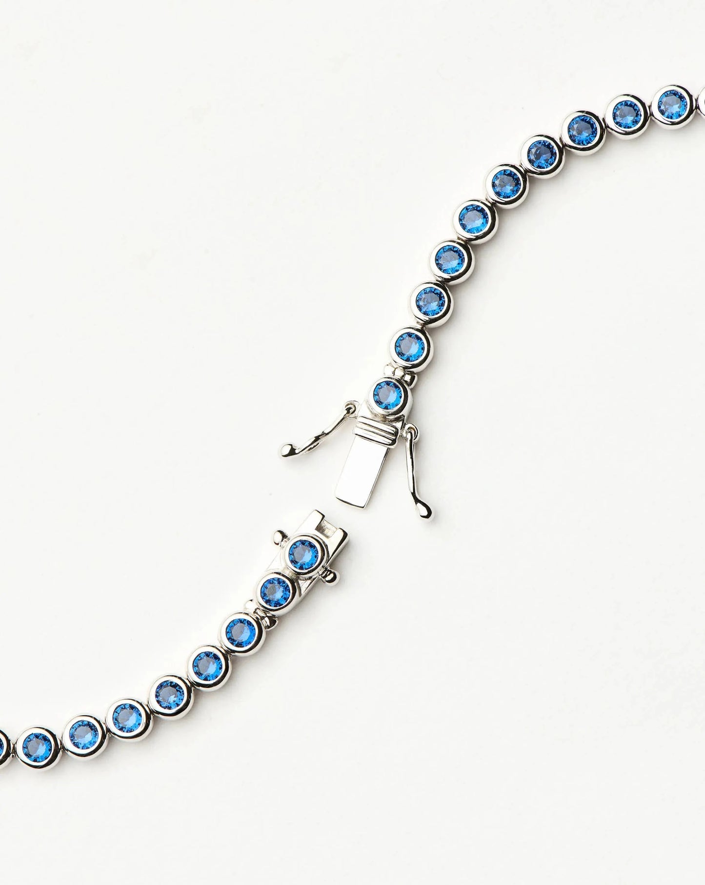 The classic you love, updated with a colourful twist. This luxurious bracelet features beaded detailing and is embellished with rounded faceted sapphire blue nano-crystals, perfect for September birthdays. The classic box clasp has both a double-ridged push-button closure and a lever closure for added security. Let it shine solo or team with chunky chains for an instant arm stack.