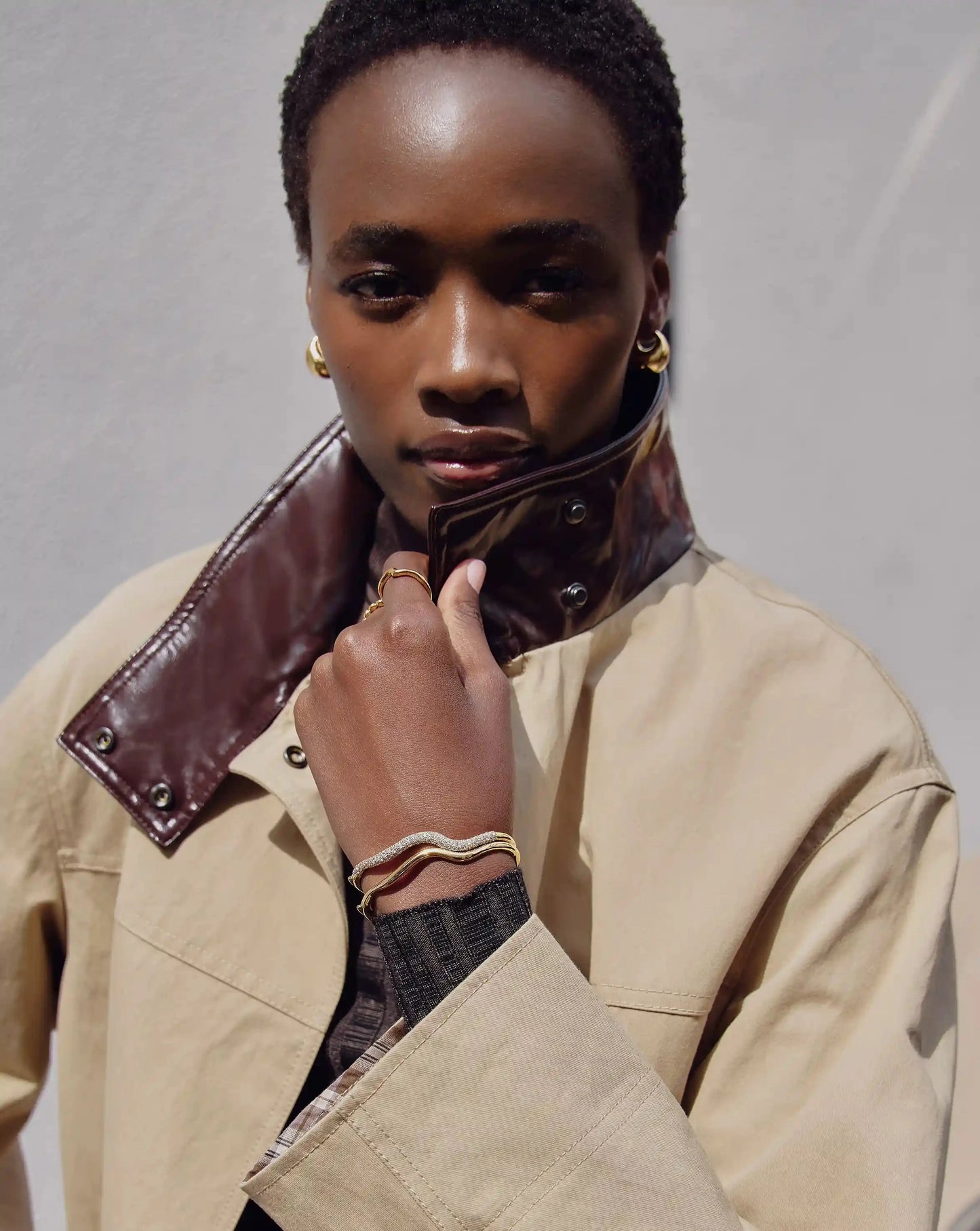 An evolution of our best selling Molten and Magma collections with soft organic curves. The molten gold texture gives the hinged bangle a sculptural look with a frosting of snow pavé to mimic ice crystals. Artfully hand-set, this highly-skilled technique is usually only seen in the most delicate of fine jewellery pieces. Designed with a hinged closure for easy wear, its refined curves and subtle shimmer make it the perfect piece to elevate your everyday bracelet stack.