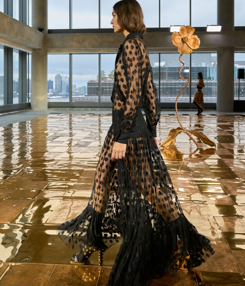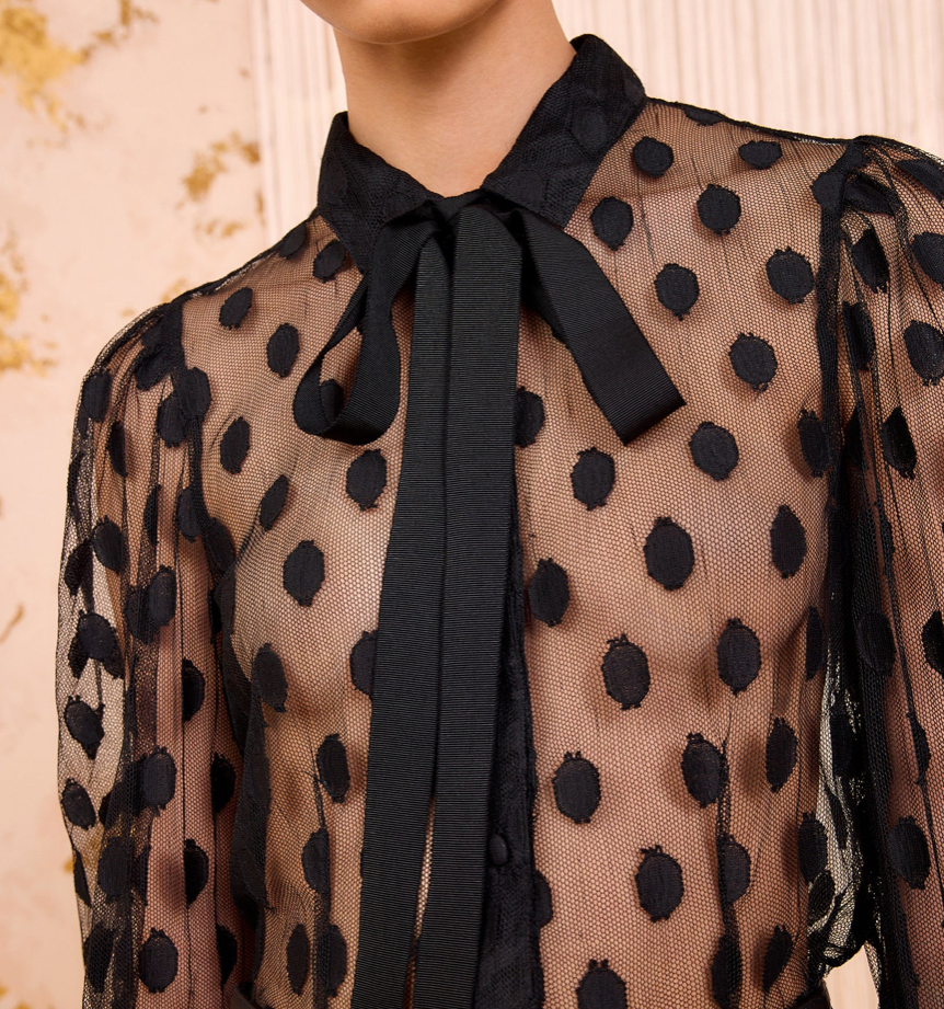 Look 6 on the AW25 runway showcases the Soraya Blouse, an ethereal black top in our gossamer lace dot, a delicate cotton-blend with effortlessly playful polka dots. This sheer top gently billows at the sleeves and has a ribbon necktie for a vintage touch.