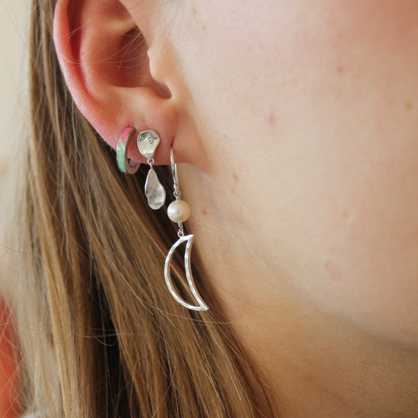 Description: Enchanting moon earring with a beautiful, natural freshwater pearl on top. The earring is great to mix and match with other darlings.
