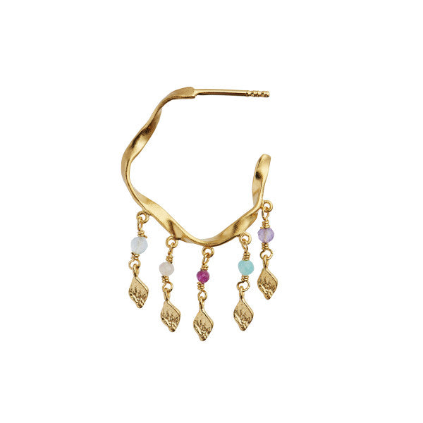 Description: Lovely dancing hoop with twisted details and playful pendants of gemstones and colorful gemstones.