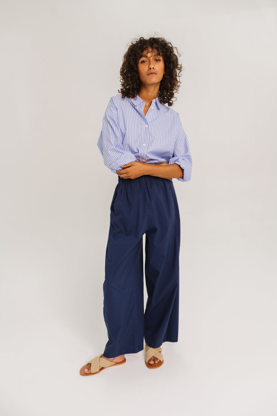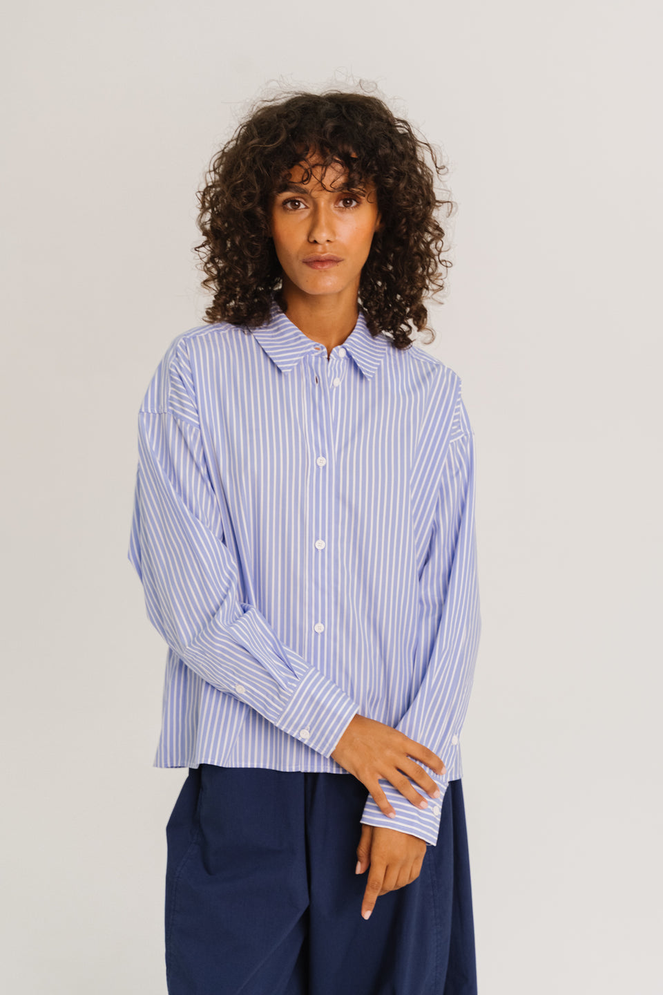 Long-sleeved cotton poplin shirt with a cropped cut and dropped shoulders. Inspired by men's shirts, it features pleats in the back and buttoned cuffs.