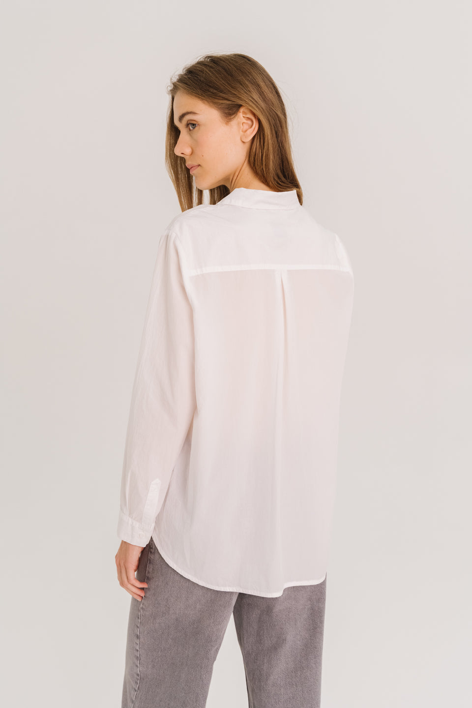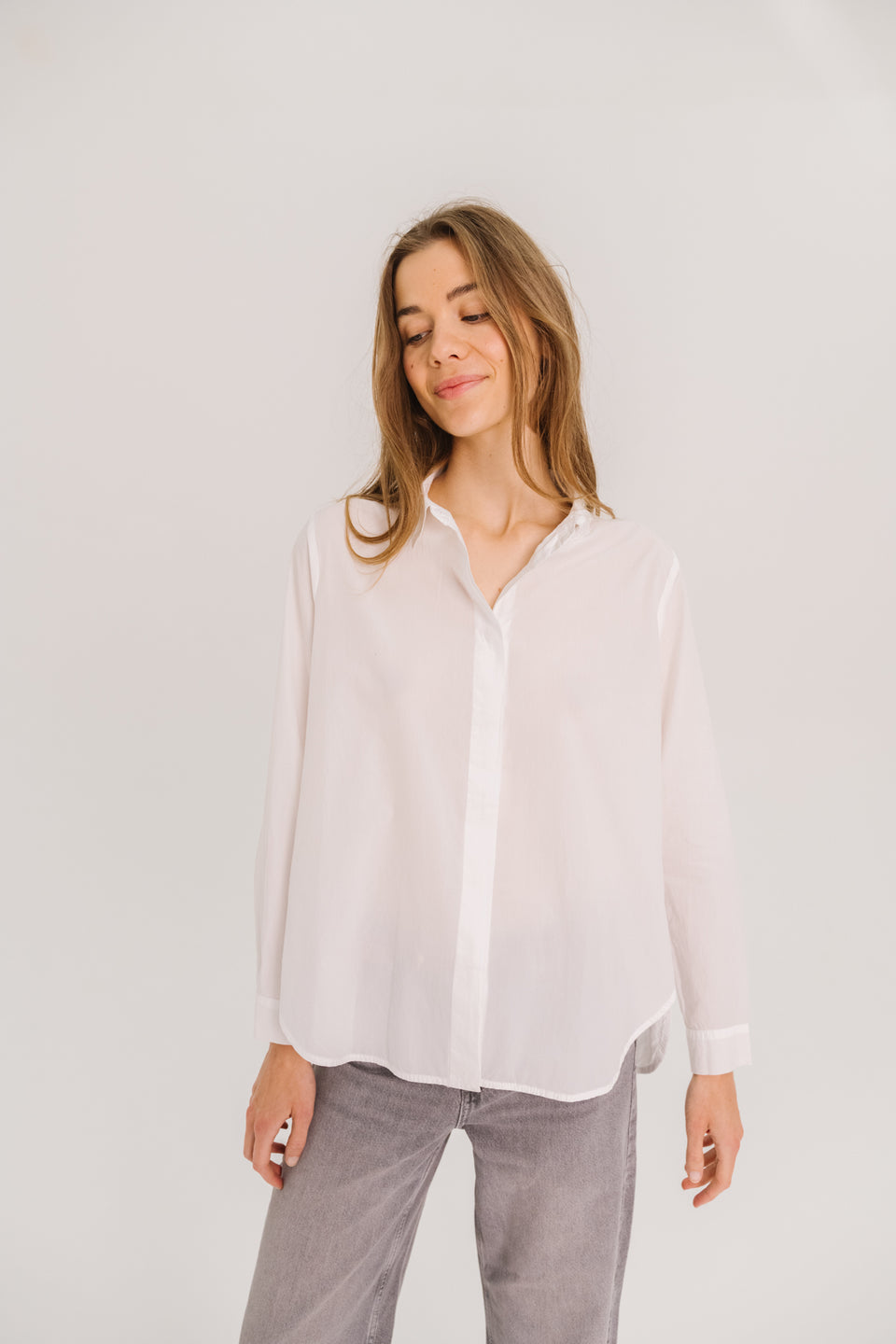 Long-sleeved cotton shirt with a relaxed, clean cut. Classic shirt collar and concealed button placket for a clean silhouette. Back yoke and wide pleat for added fluidity.