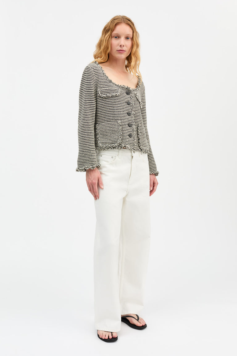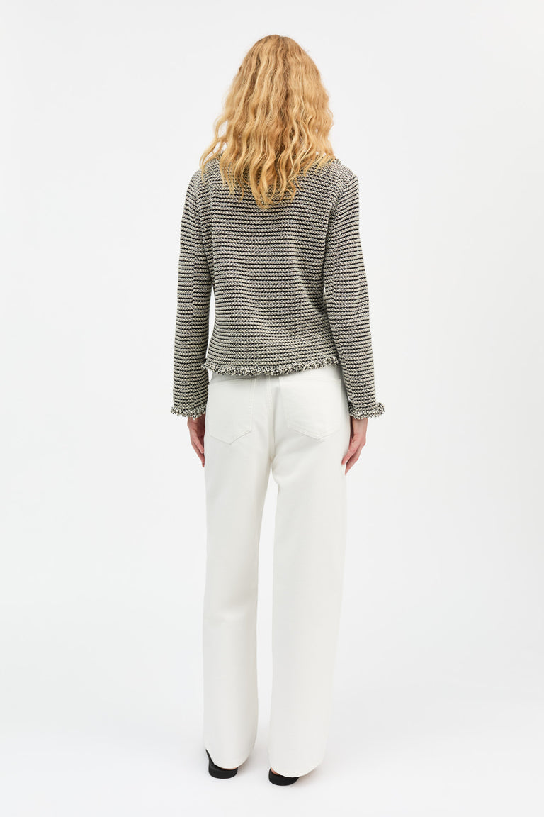 Fitted jacket with pockets and raw edges.