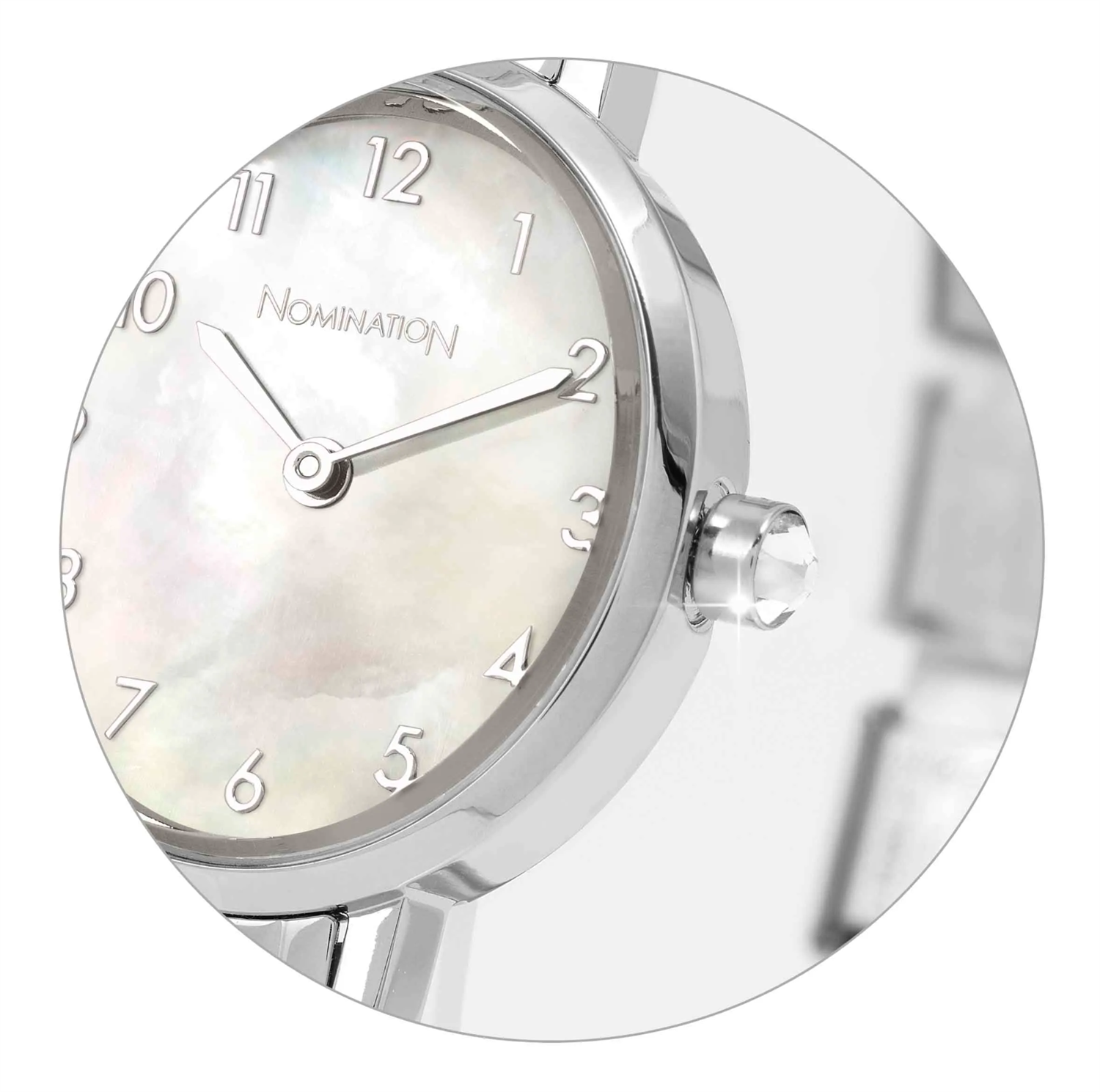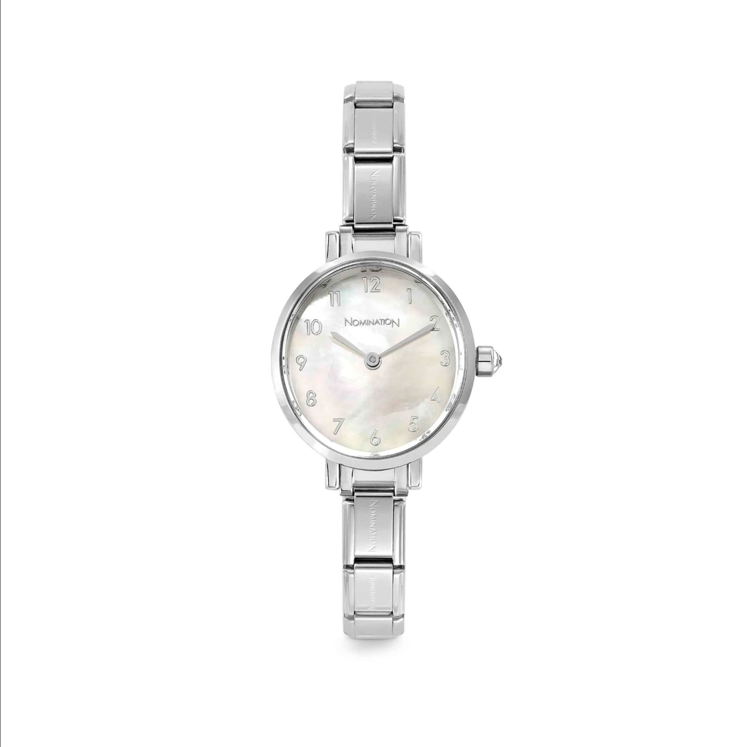 Stainless steel watch with Oval White Mother of Pearl dial and White Cubic Zirconia crown. Case size: 2.6 x 2.8 cm. Band width: 0.8 cm. Waterproof: 3 bars. You can personalise the watchband with original Composable Classic Links. Made in PRC. Choose this elegant new watch with its oval dial.