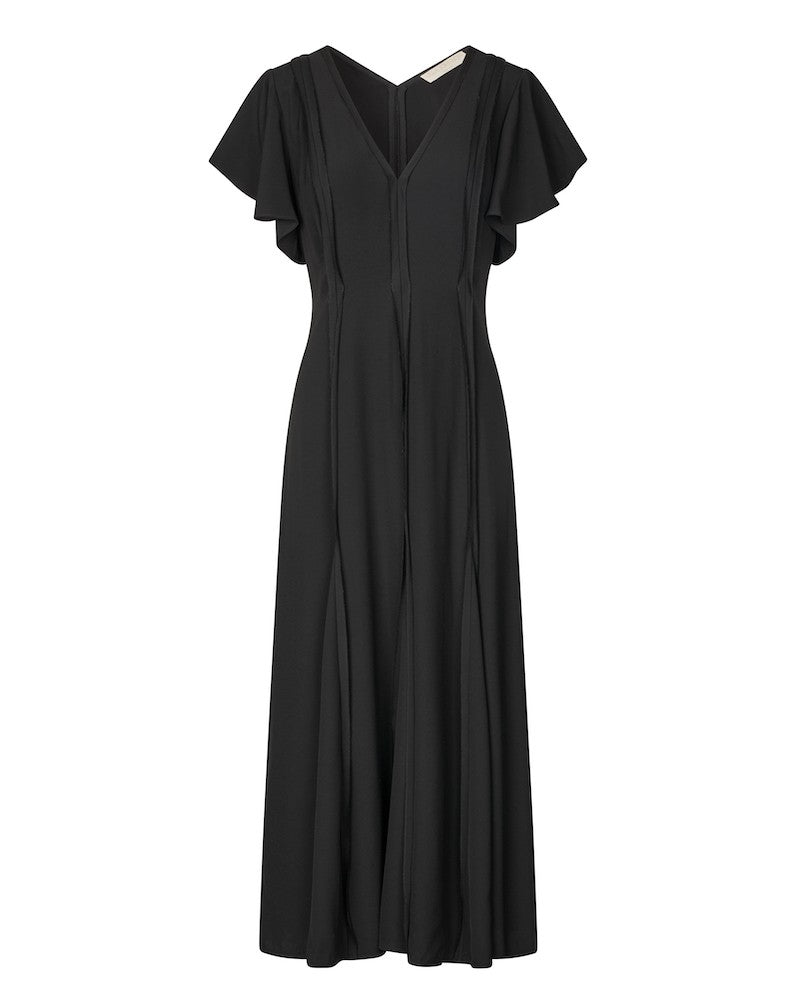 Tailored from fluid satin-back crepe. This V-neck frock has short sleeves that flutter and skims the body to a midi hem with godet detailing for mesmeric movement. It fastens with a concealed side zipper.