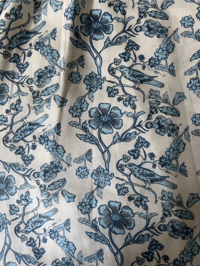 Pyjamas with hand-drawn patterns depicting flowers and birds in a garland, in shades of blue on a milky white background. Refined, feminine and fresh. Oeko-Tex cotton satin.