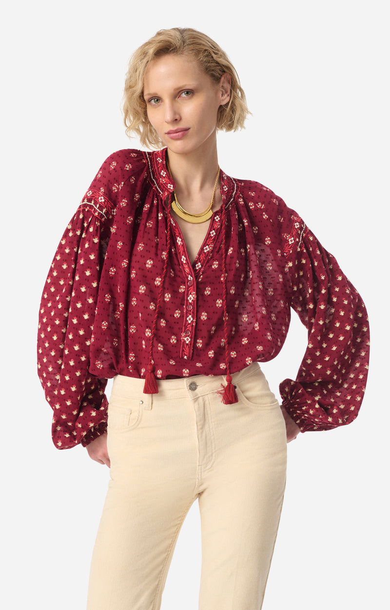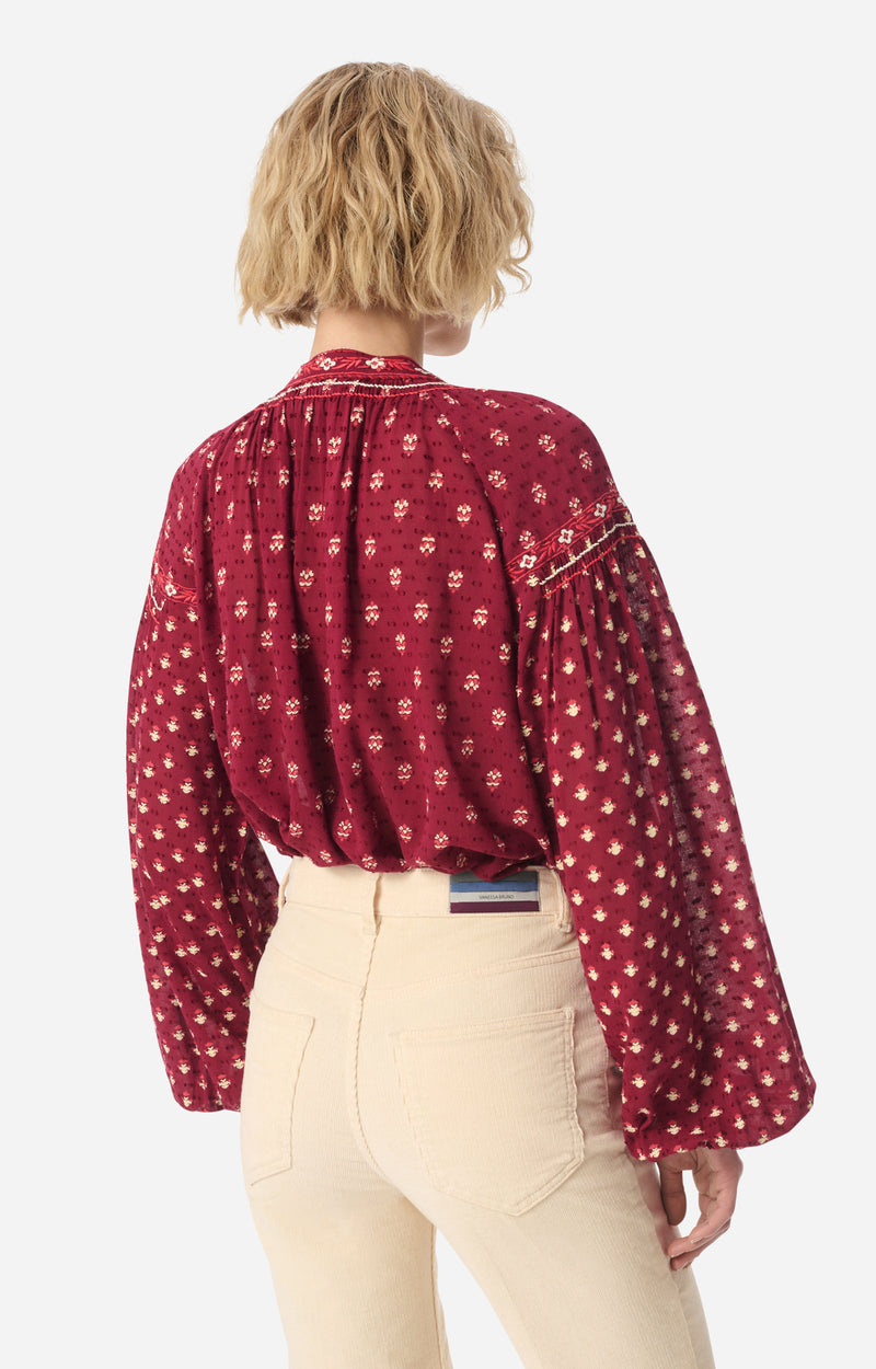 Light and feminine, this printed blouse charms with its flowing volume and puffed sleeves that add a soft bohemian touch. Its delicately gathered V-neckline structures the décolleté, offering a piece that is easy to wear and pair with everyday outfits.