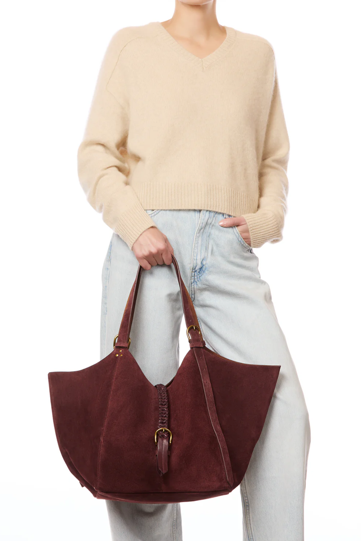 Bag with adjustable handles from 40 cm to 74 cm, allowing for hand or shoulder carry. Closure with a hand-braided central tab. Features a single main compartment with an interior flat pocket, as well as a pouch attached inside with a leather tie.