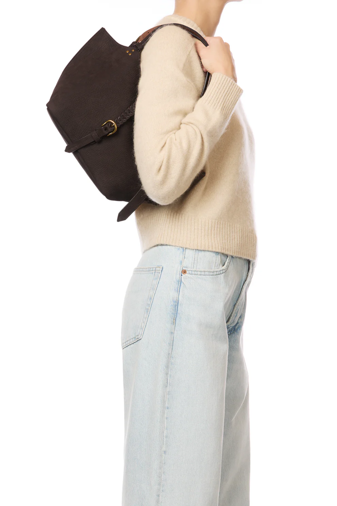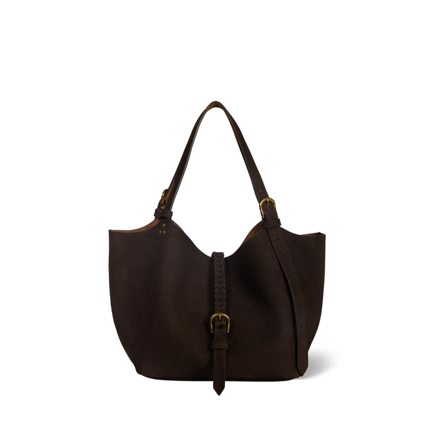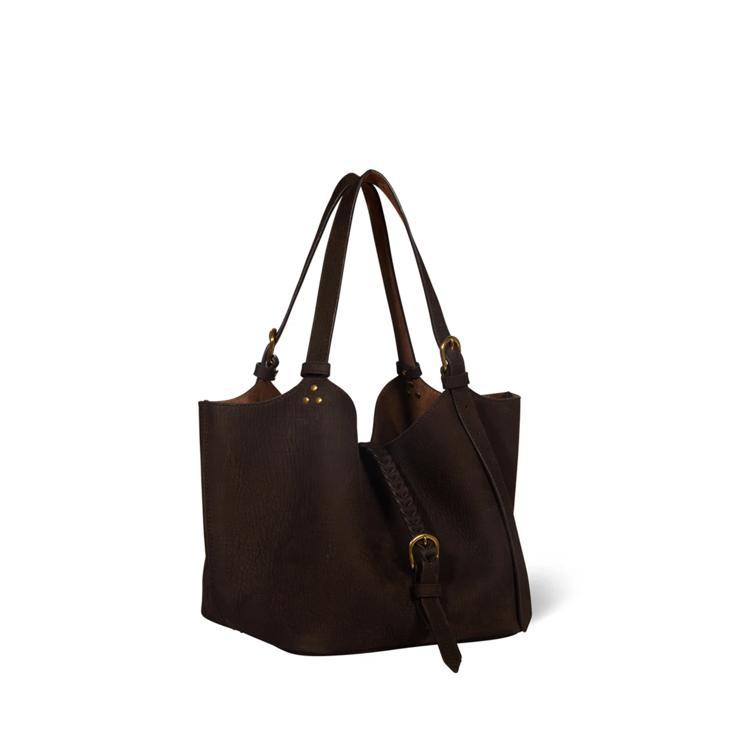 Bag with adjustable handles from 25 cm to 56.5 cm, allowing for hand or shoulder carry. Closure with a hand-braided central tab. Designed with a single main compartment and a pouch attached inside with a leather tie.