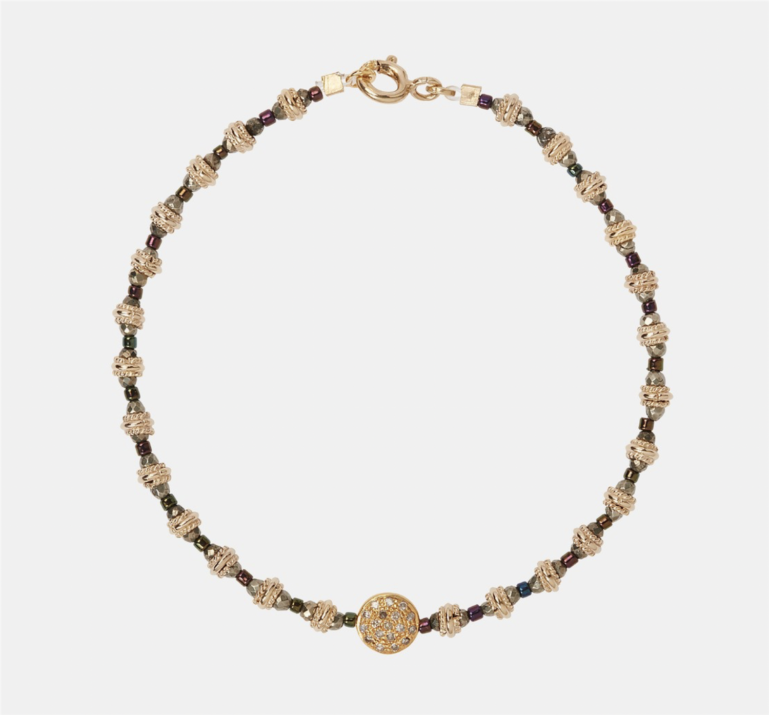 24 karat gold vermeil bracelet, matsuno pearls, pyrites and diamond-paved medal.