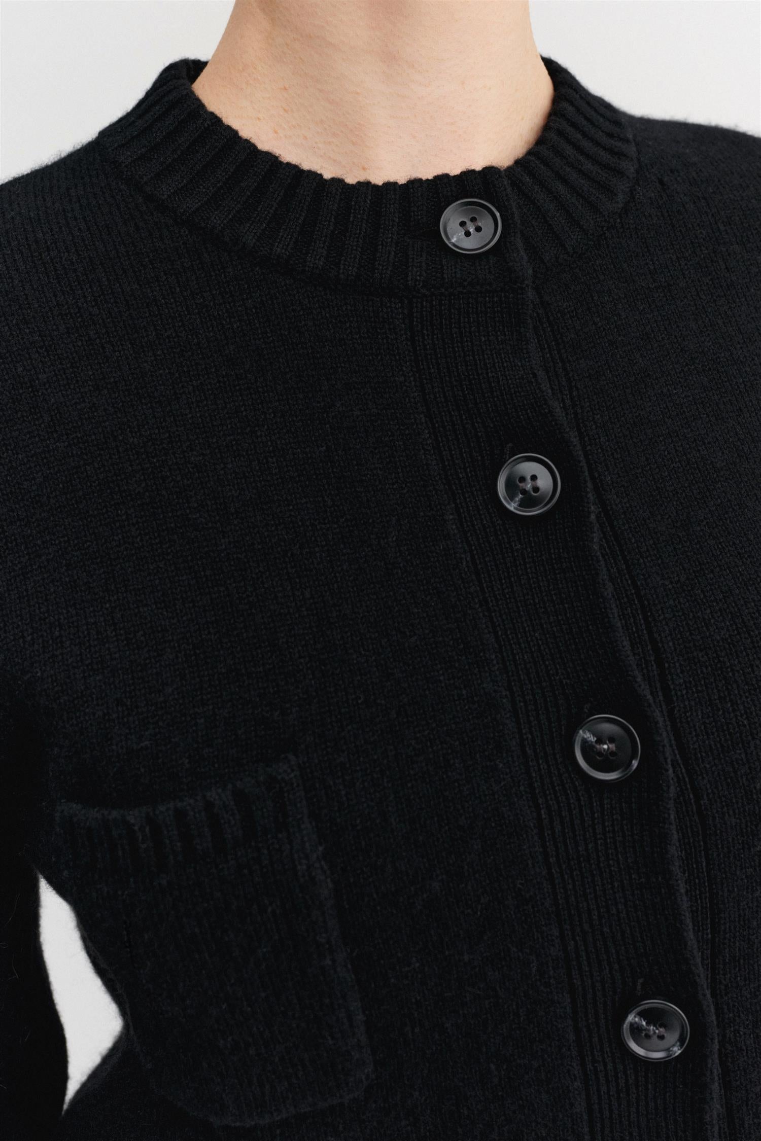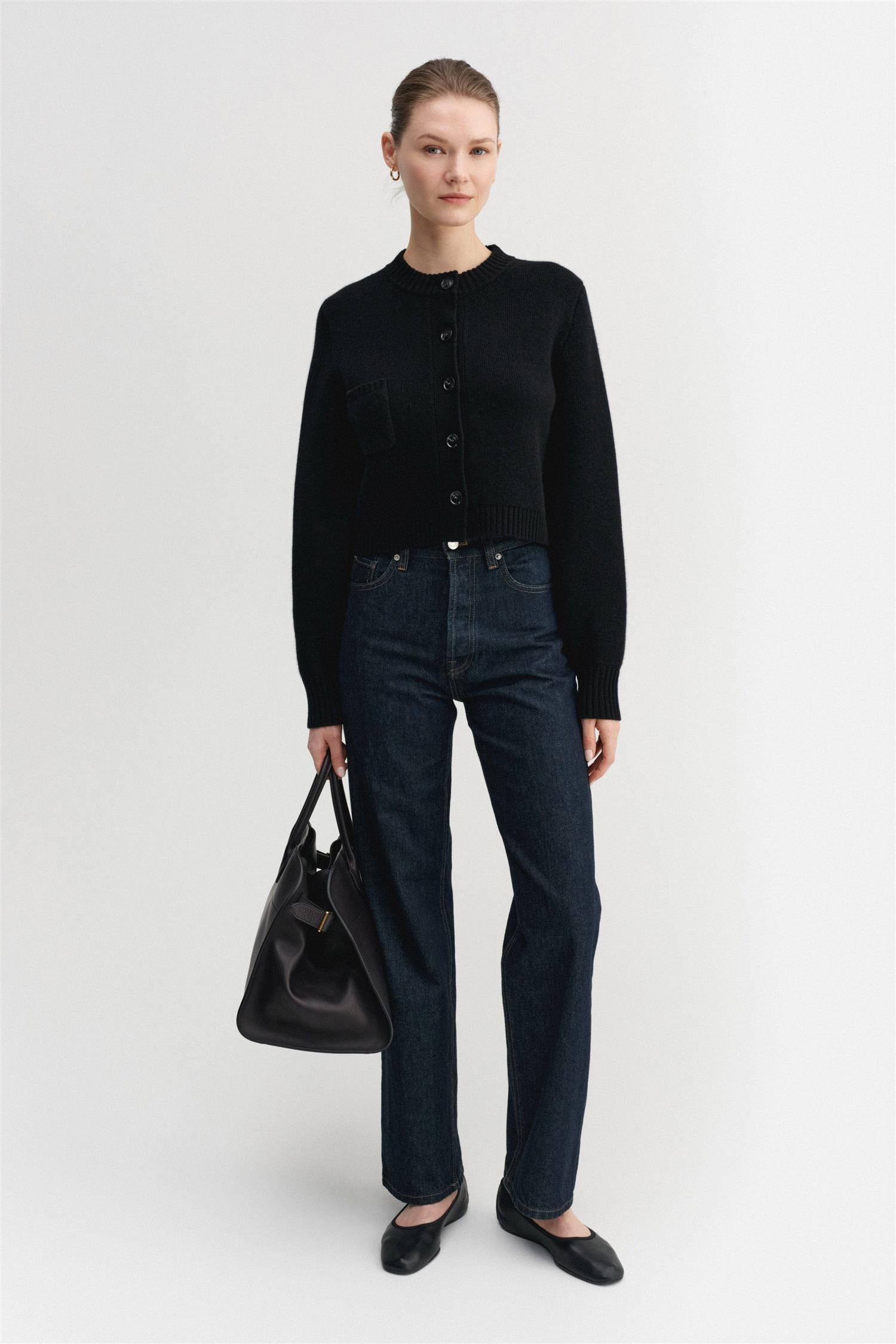 Zozo Cardigan is densely knitted from the softest cashmere and merino wool blend. The cardigan is designed for a slightly boxy and loose fit with a cropped silhouette. The cardigan is featured with a classic crew neckline, dropped shoulders, tonal buttons and a little patch pocket. Rib-knitted detailing in cuffs, hem and the pockets.