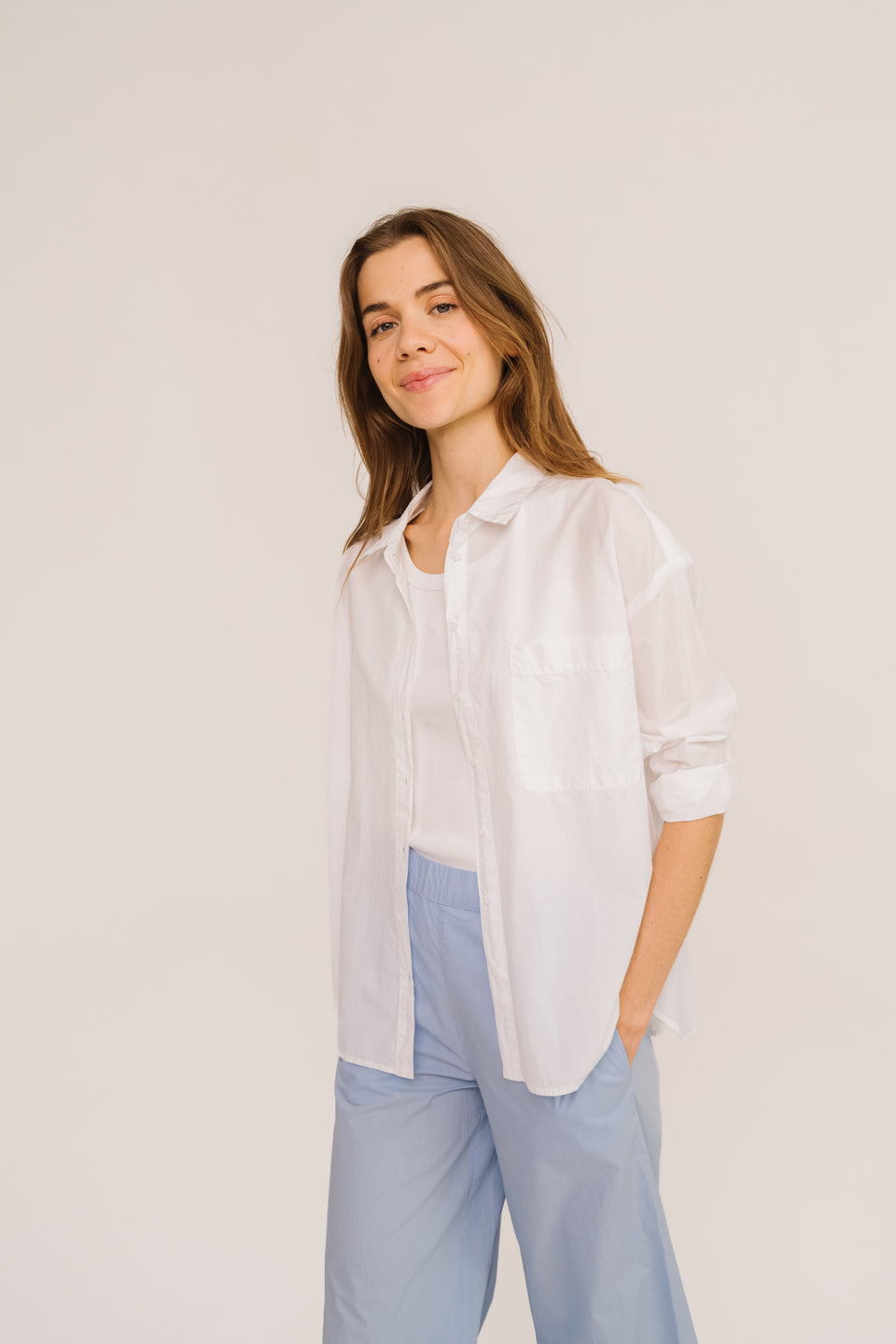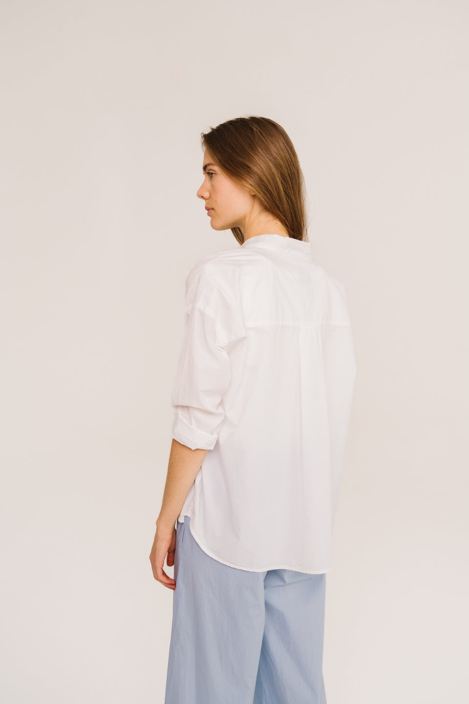 Plain, long-sleeved shirt in cotton poplin. Loose fit with a back pleat for a relaxed look. Patch chest pocket, classic collar, and exposed button placket. Buttoned cuffs and placket add a modern touch.