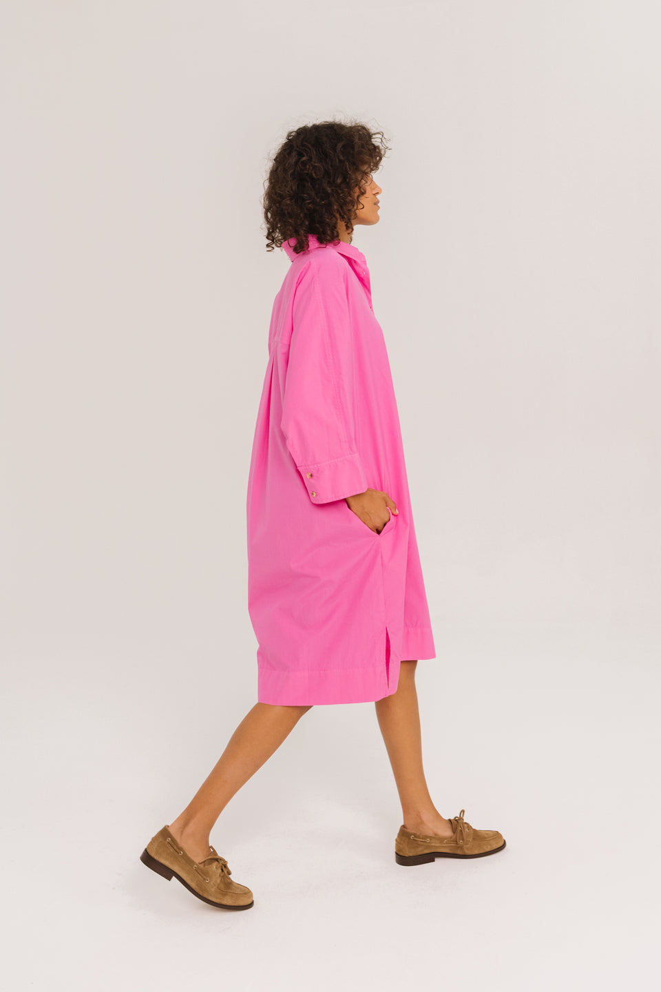 Plain midi shirt dress with 3/4 kimono sleeves. Shirt collar, pleat in the back and discreet pockets in the seams for a clean and feminine look.