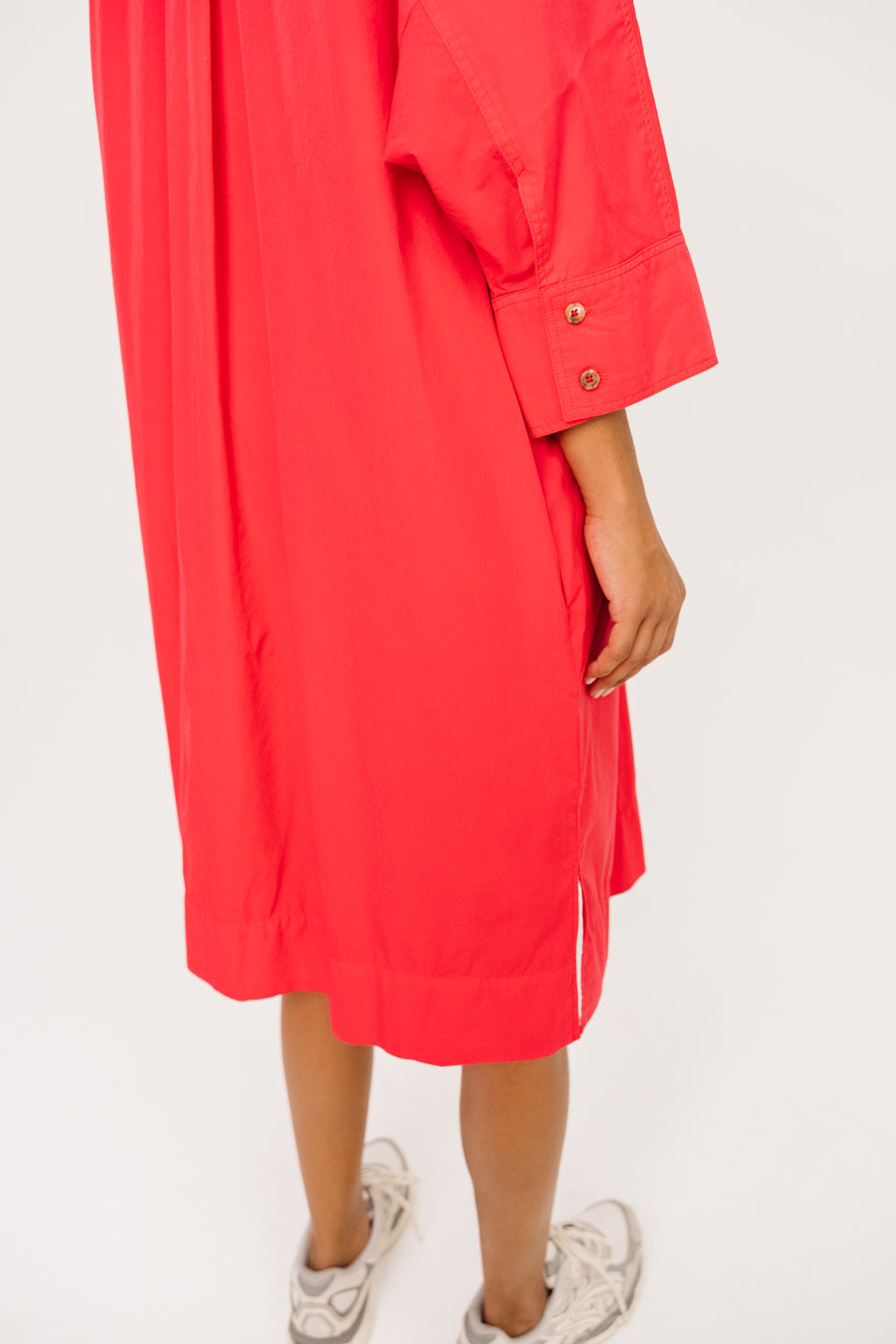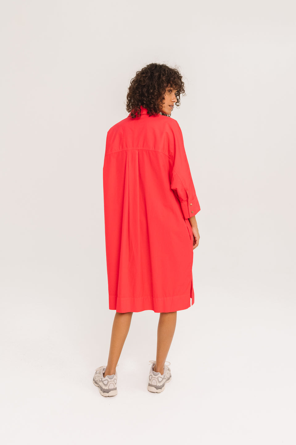 Plain midi shirt dress with 3/4 kimono sleeves. Shirt collar, pleat at the back, and discreet in-seam pockets for a clean and feminine look.